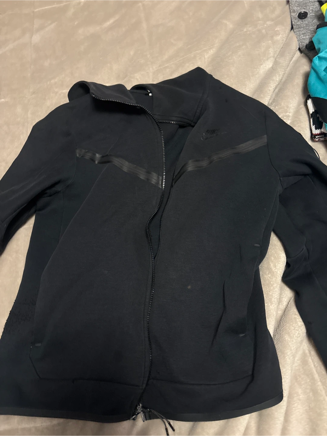 Black Nike Tech Fleece full-zip hoodie. It's made of a soft cotton blend. This hoodie is great for staying warm and comfortable.