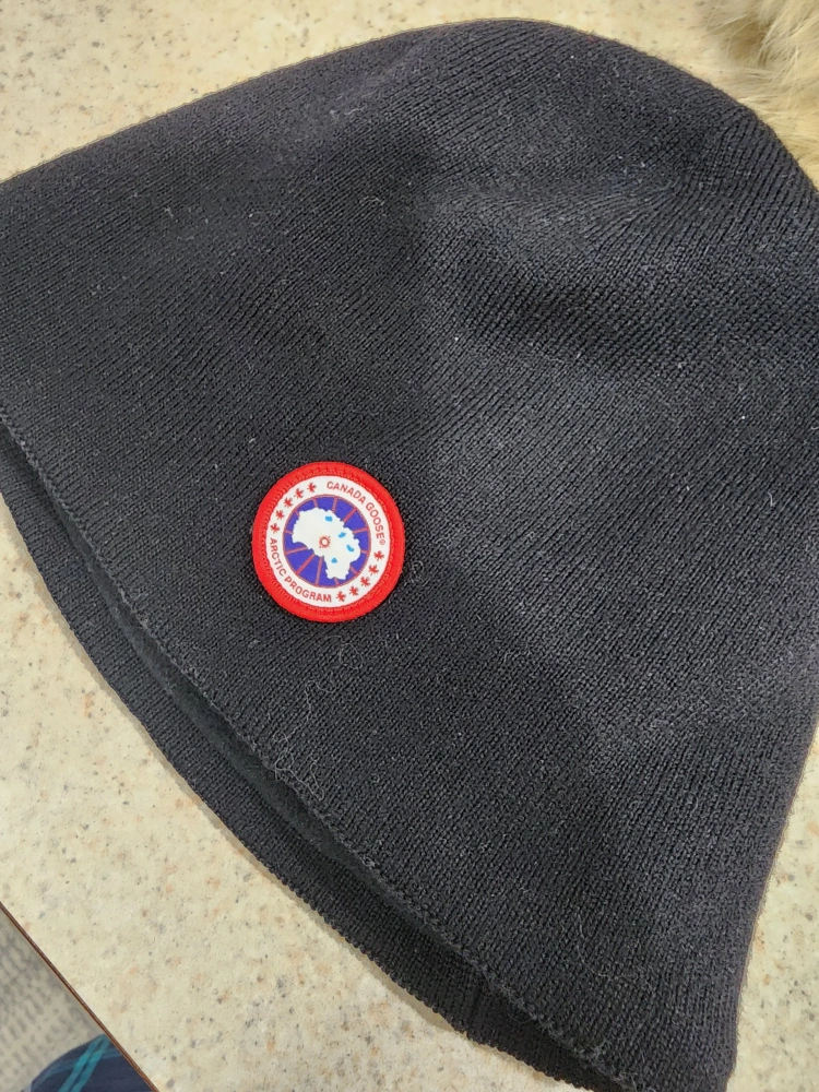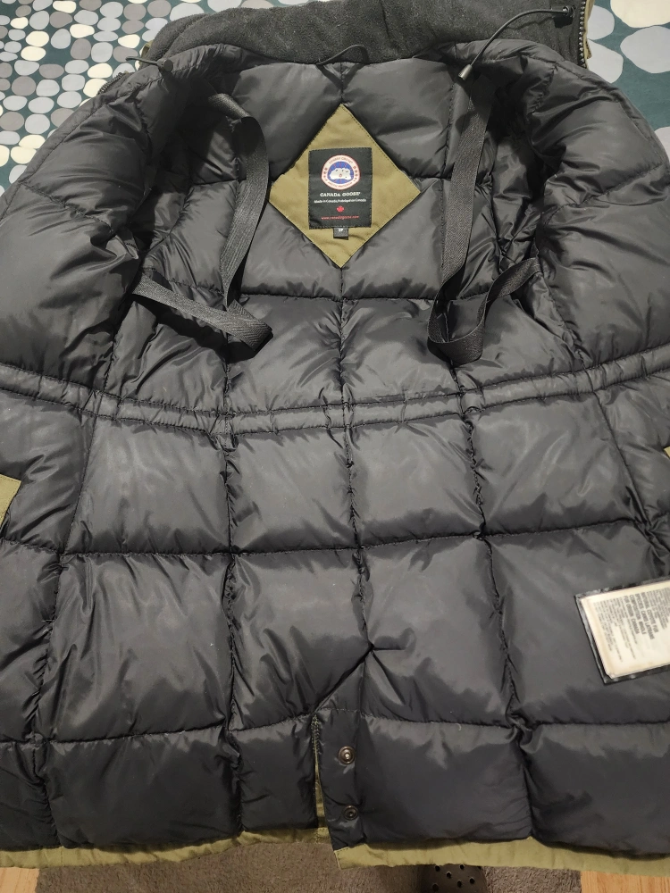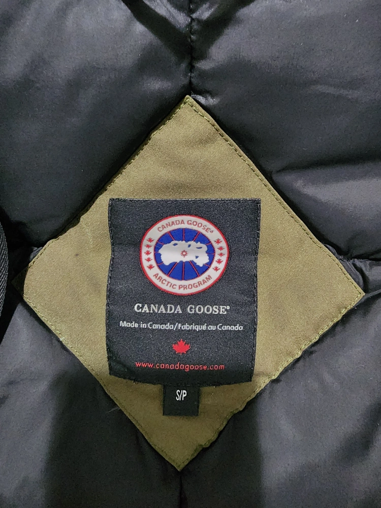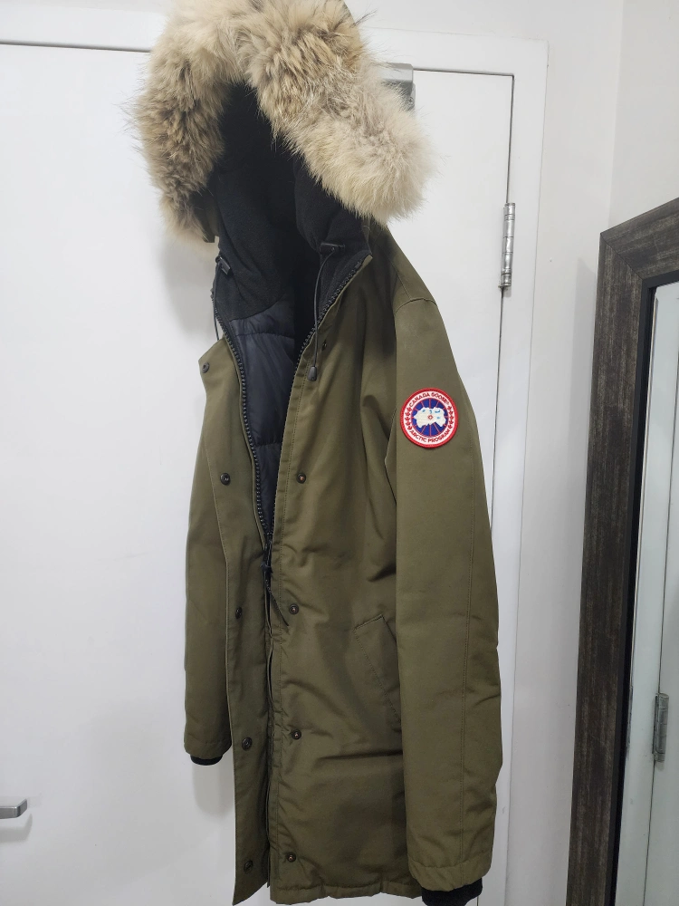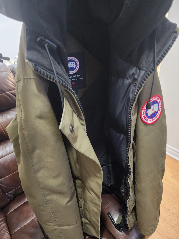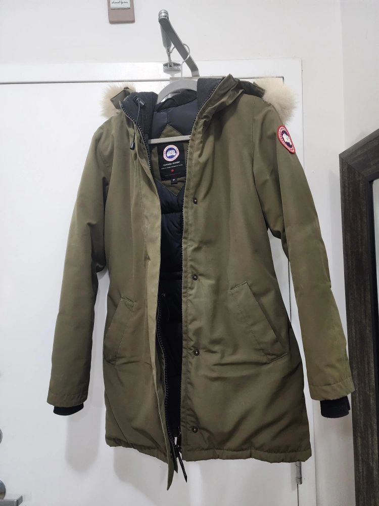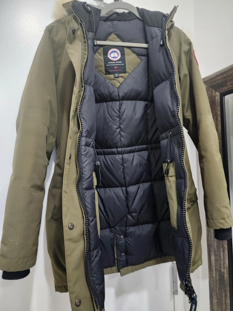 Canada Goose down-filled parka jacket in a military green colour. It's a size small women with a fur-lined hood. This warm jacket is great for the colder months! Also includes a Canada Goose toque