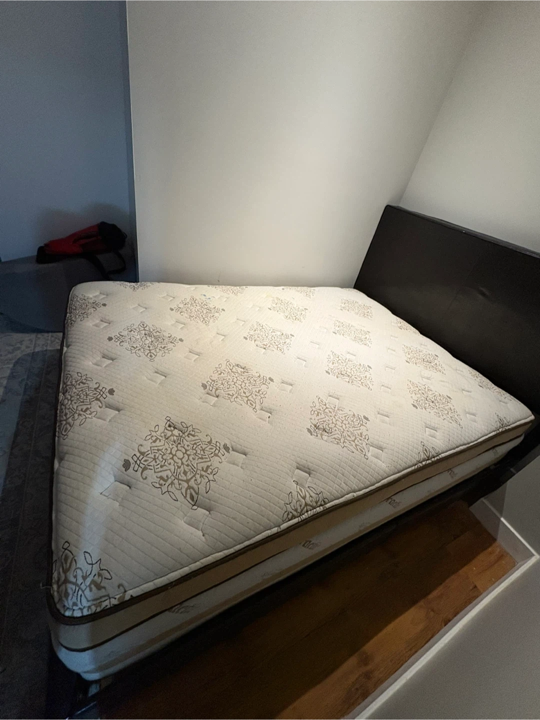Selling a used queen sized mattress in good condition. It has a patterned design on the top. Perfect for a spare room or a starter bed!