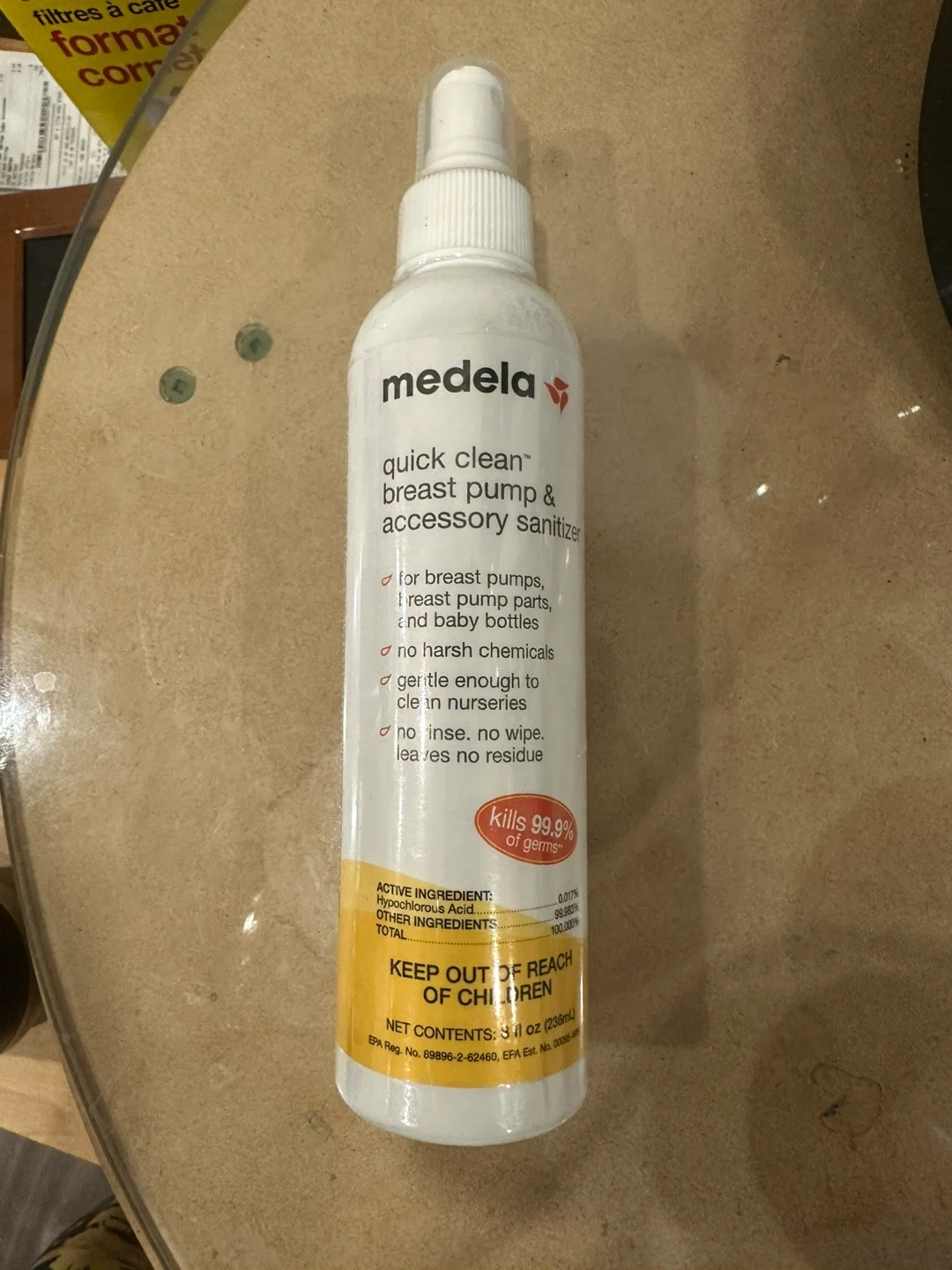 This Medela Quick Clean spray sanitizes breast pumps, parts, and baby bottles. It's gentle enough for nurseries and requires no rinsing or wiping. Kills 99.9% of germs. Use it to quickly sanitize items when on the go.