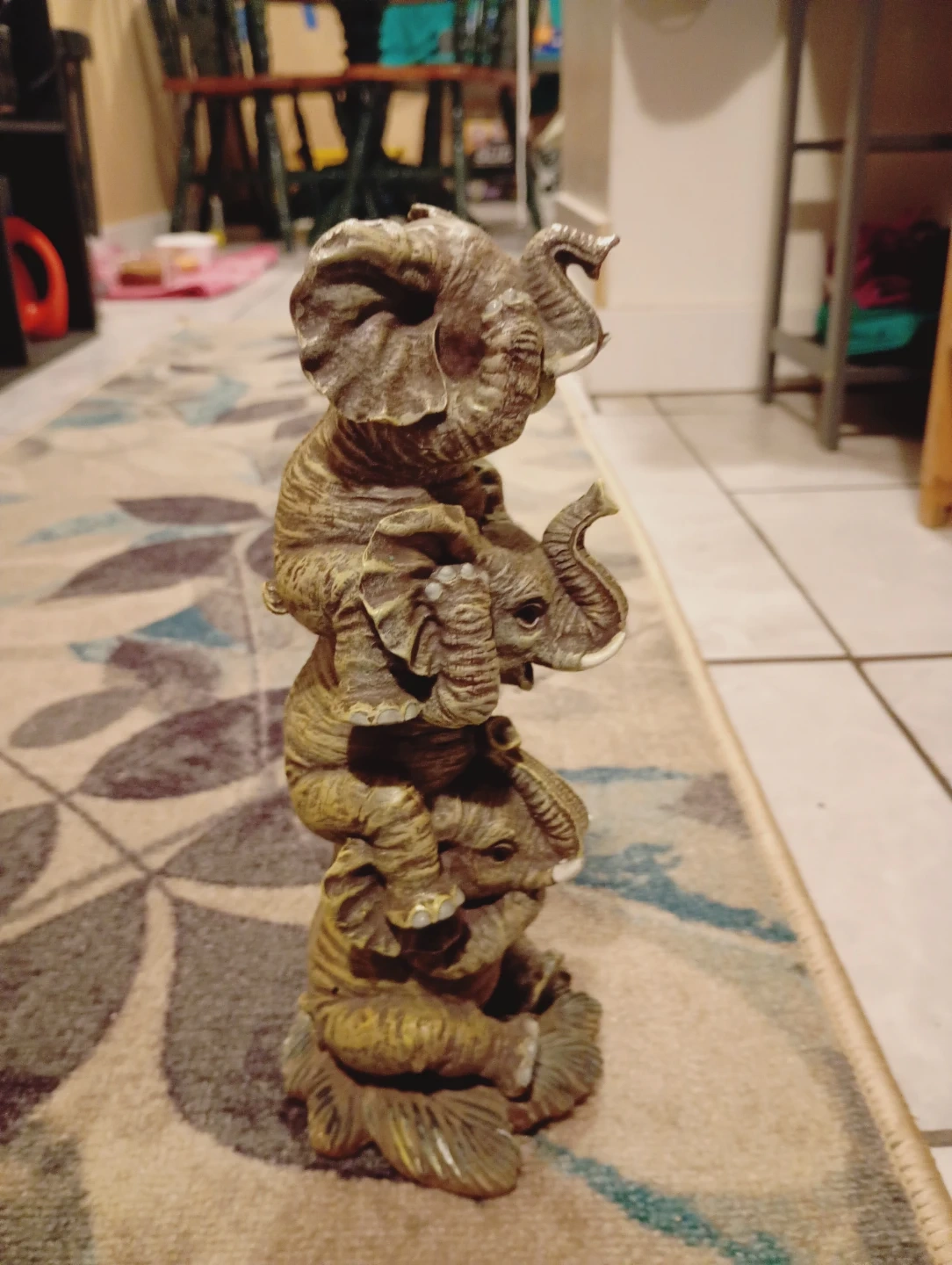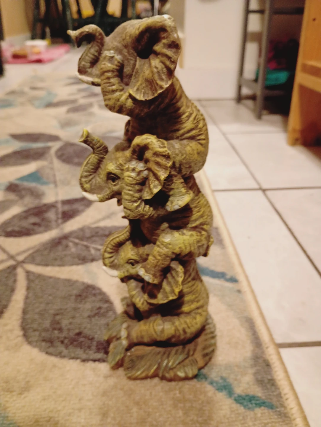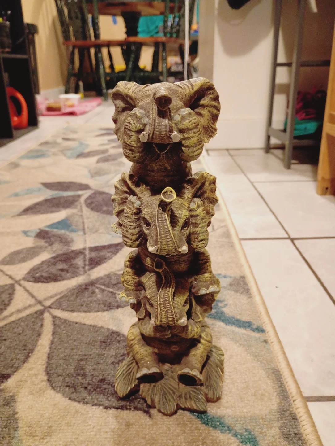 A charming decorative figurine featuring a stack of four elephants. This piece showcases a detailed, textured finish. It's a unique accent for any shelf or tabletop.