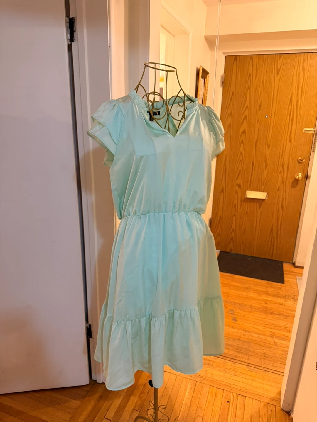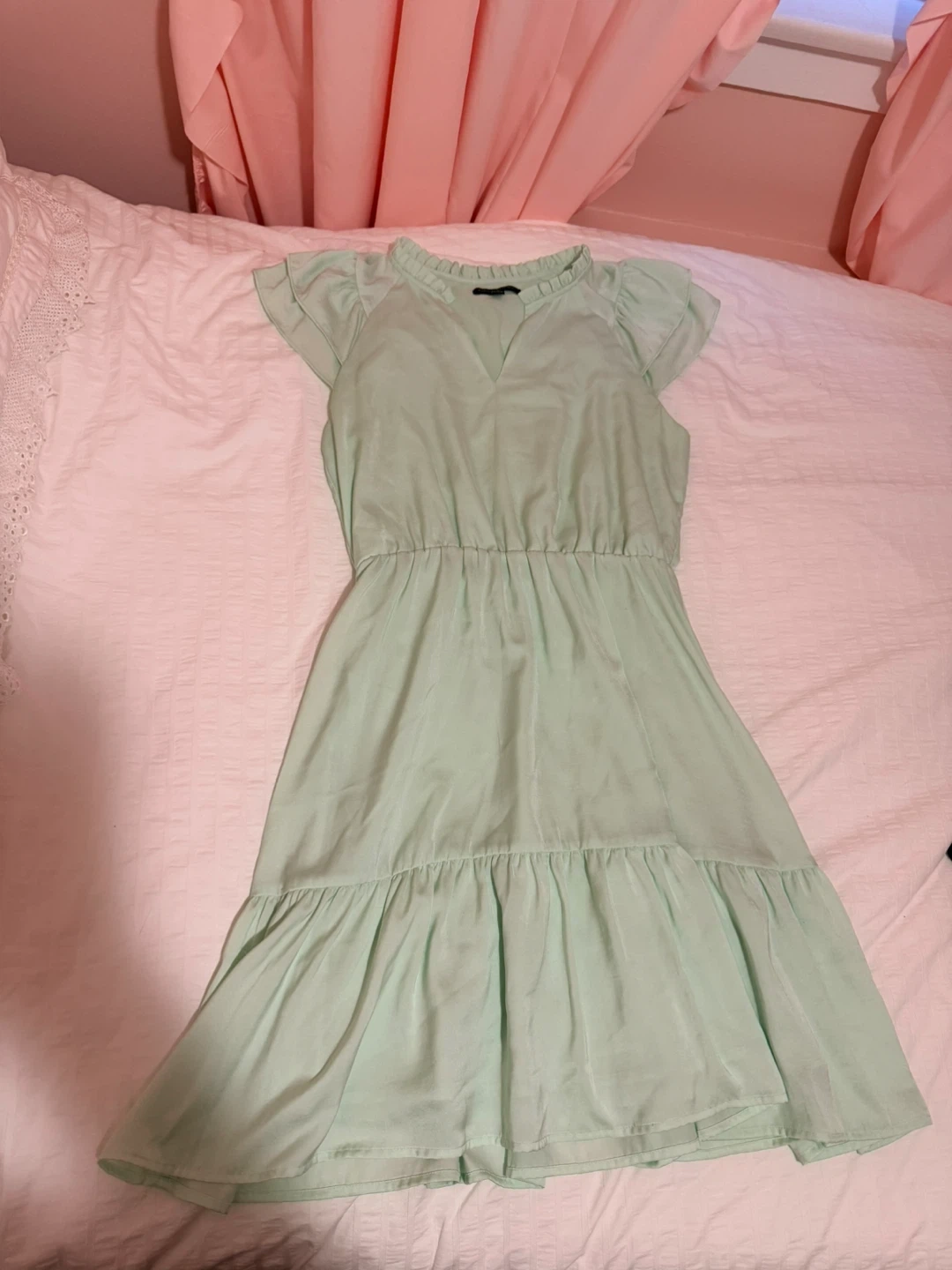 Mint green Banana Republic dress with a ruffled neckline and tiered hem. It's a small, size petite and made of a light, flowing material. This dress is perfect for spring or summer occasions! Super elegant