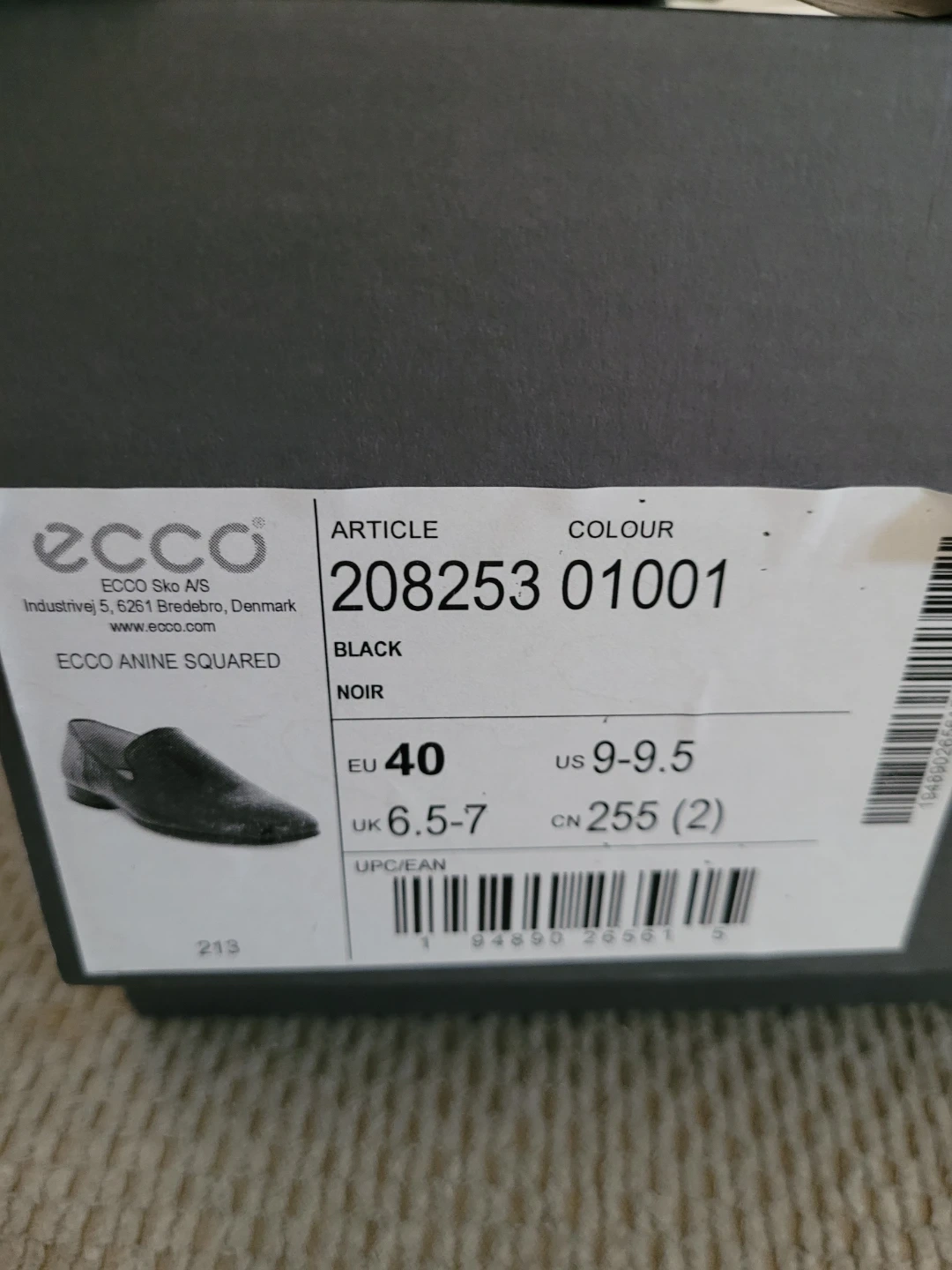These are Ecco Anine Squared loafers in black. They are size US 9-9.5 (EU 40). The shoes are in great condition and come with the original box!