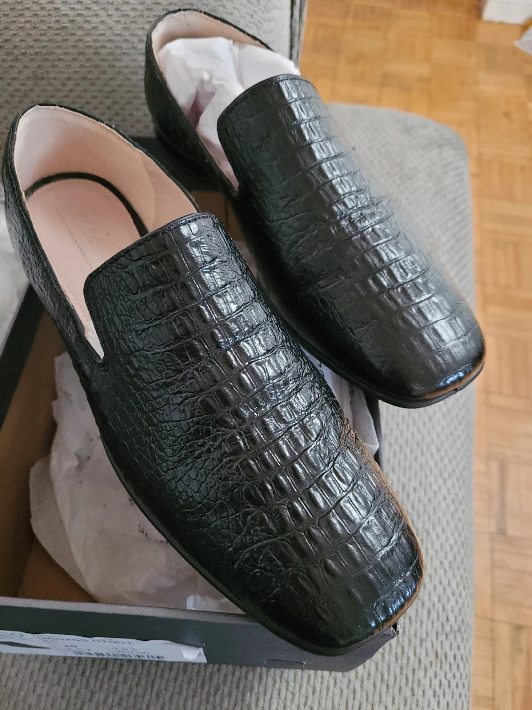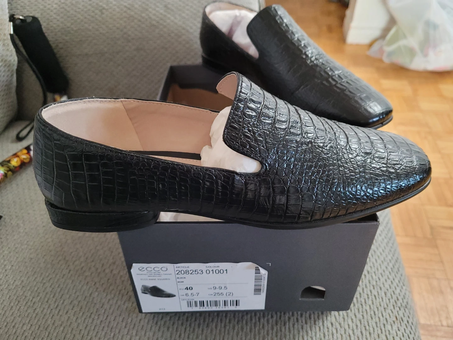 These are Ecco Anine Squared loafers in black. They are size US 9-9.5 (EU 40). The shoes are in great condition and come with the original box!
