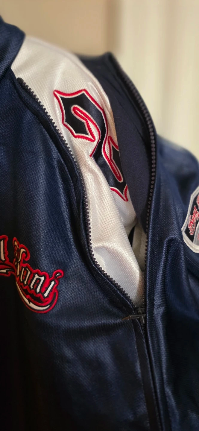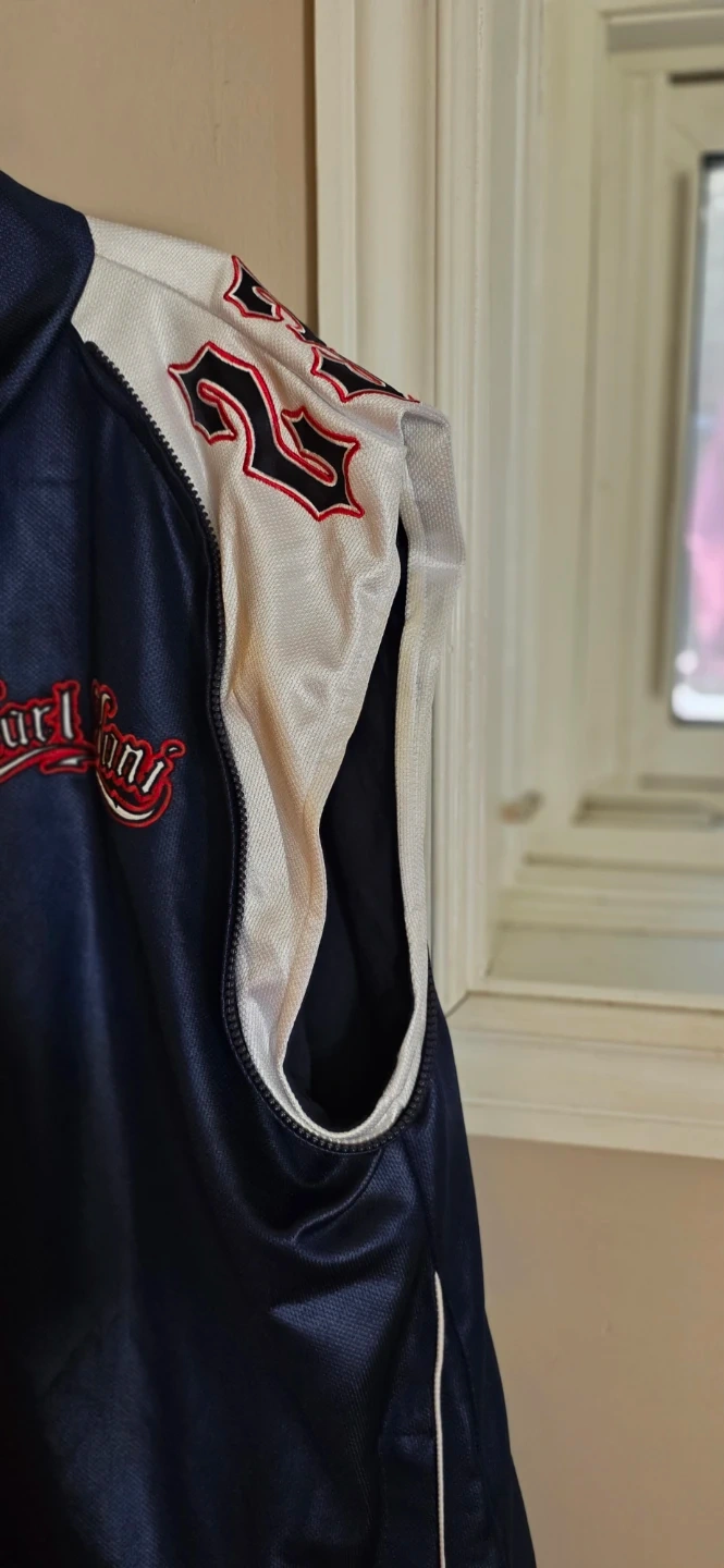 Karl Kani original citywear track jacke and matching pants in navy blue and white. Removable sleeves with full zip closure. Features embroidered Karl Kani logo on the chest and sleeve accents.