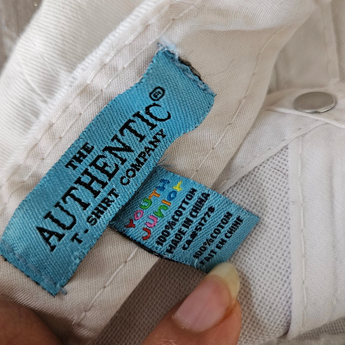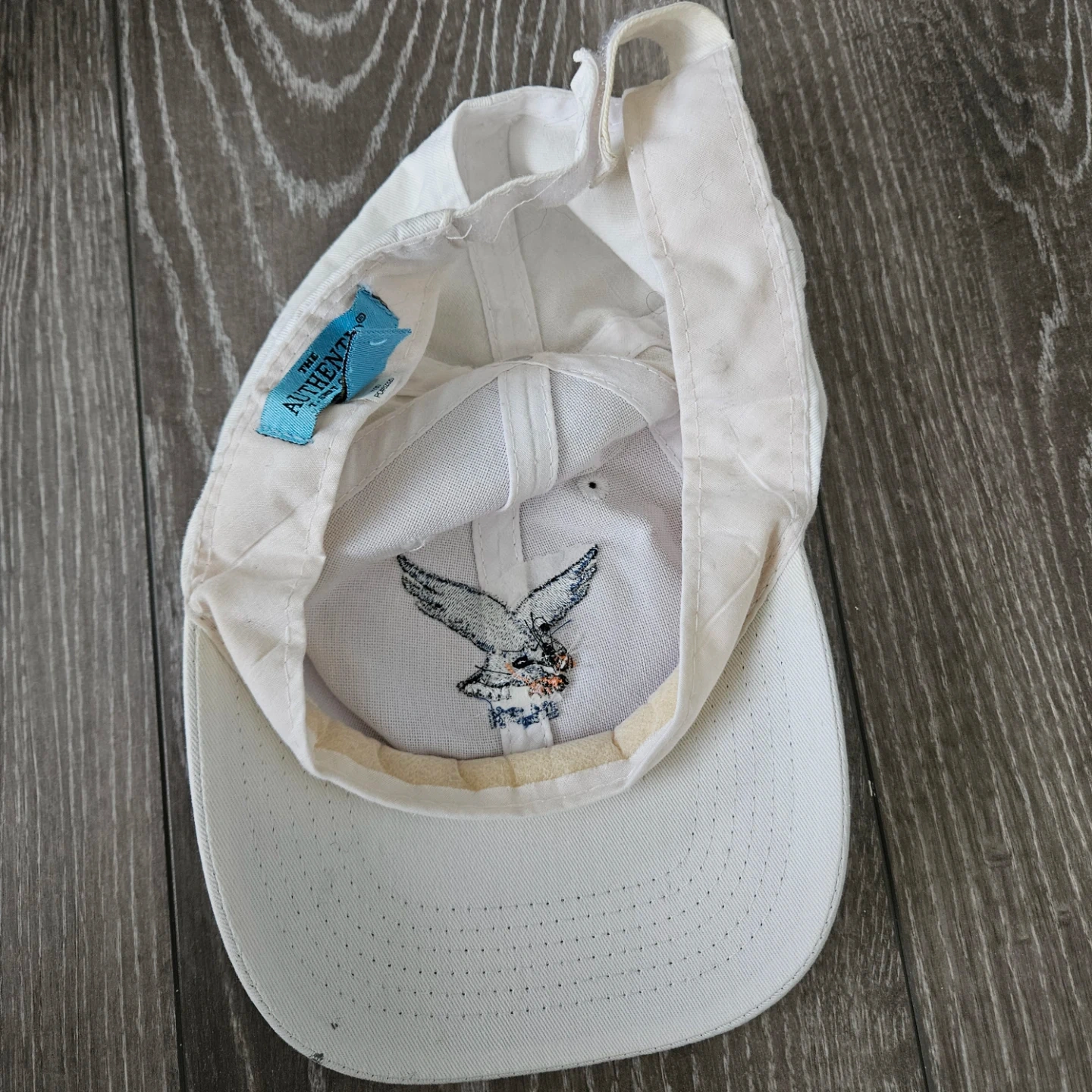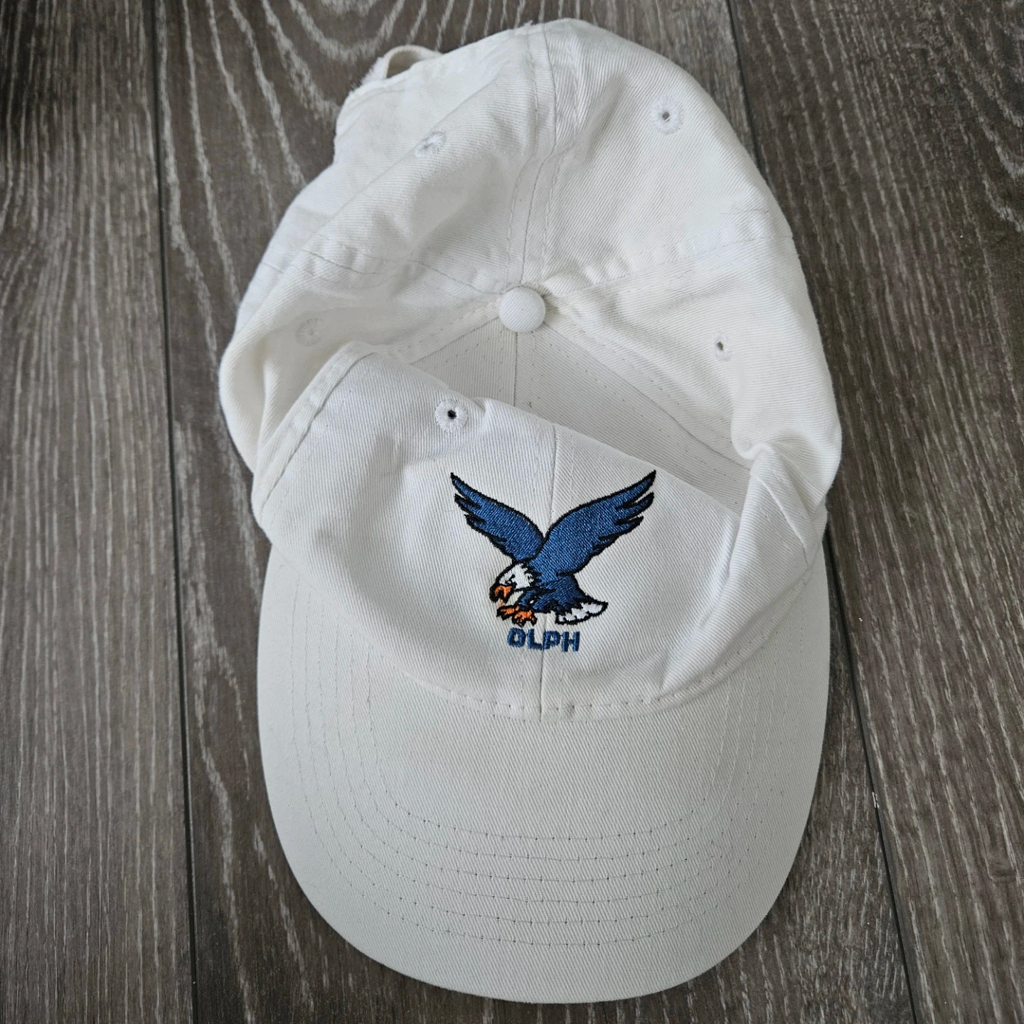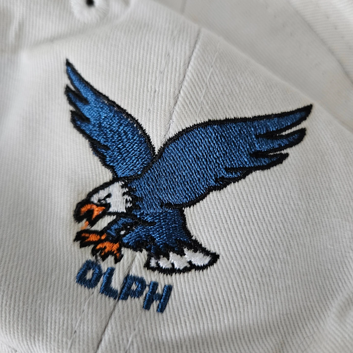 White baseball cap with an embroidered blue eagle and 'OLPH' text. It's made from 100% cotton. With an adjustable back.