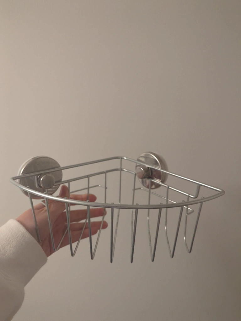 IKEA metal corner shower caddy with suction cups. Two travel-sized body lotions, one moisturizer and one hand cream.