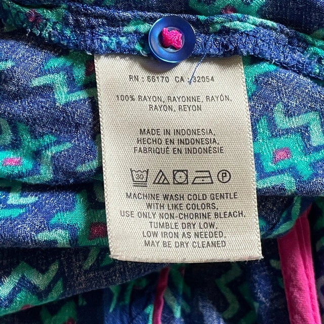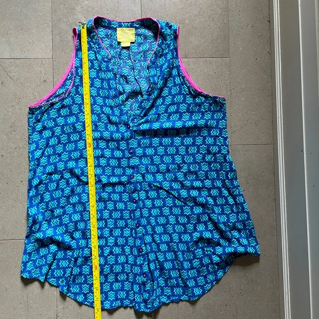 Selling a Maeve Anthropologie Ada Sleeveless Swing Blouse in Cobalt Blue with Pink Trim, size 10. Features an Aztec Geo Print, is very lightweight and airy, with a deep V-neckline and full button front. Solid fuchsia banded trim at the neck and arm openings. Gently used with an extra button attached inside. Measurements taken flat: Pit to pit: 19.5", Length: 28". Asking $25. Available for pick up in the Broadview/Danforth area. Contact-free porch pick up is available. Cash accepted.