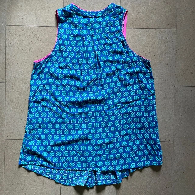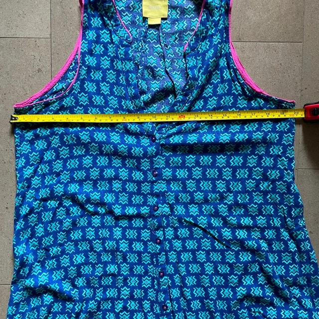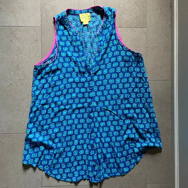 Selling a Maeve Anthropologie Ada Sleeveless Swing Blouse in Cobalt Blue with Pink Trim, size 10. Features an Aztec Geo Print, is very lightweight and airy, with a deep V-neckline and full button front. Solid fuchsia banded trim at the neck and arm openings. Gently used with an extra button attached inside. Measurements taken flat: Pit to pit: 19.5", Length: 28". Asking $25. Available for pick up in the Broadview/Danforth area. Contact-free porch pick up is available. Cash accepted.
