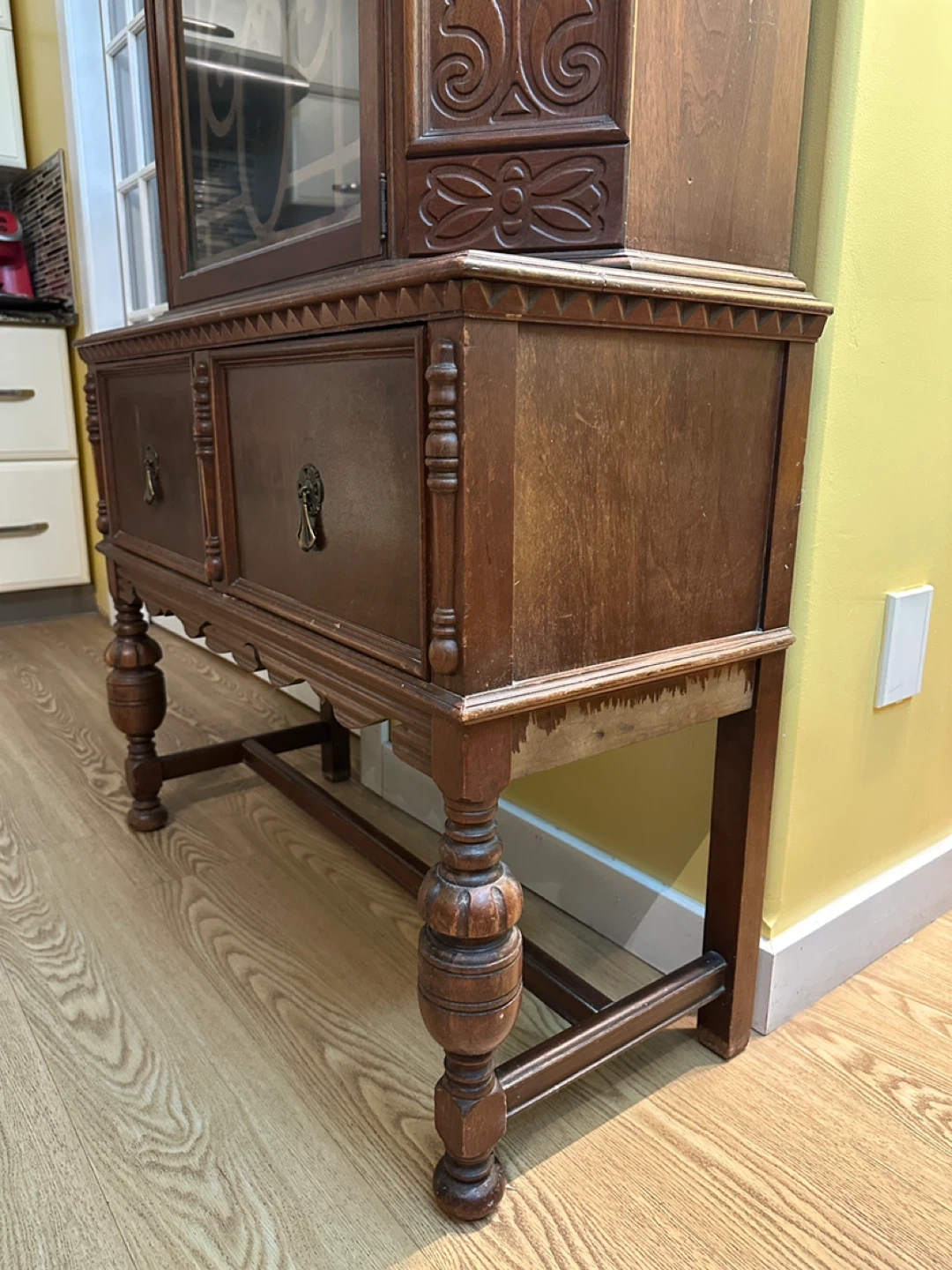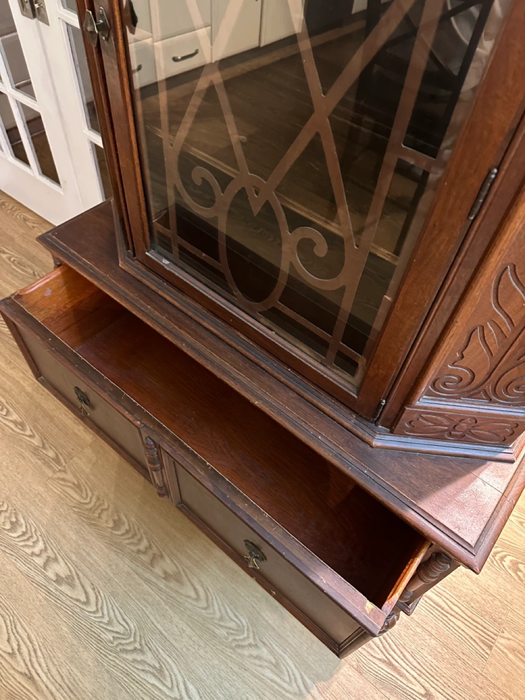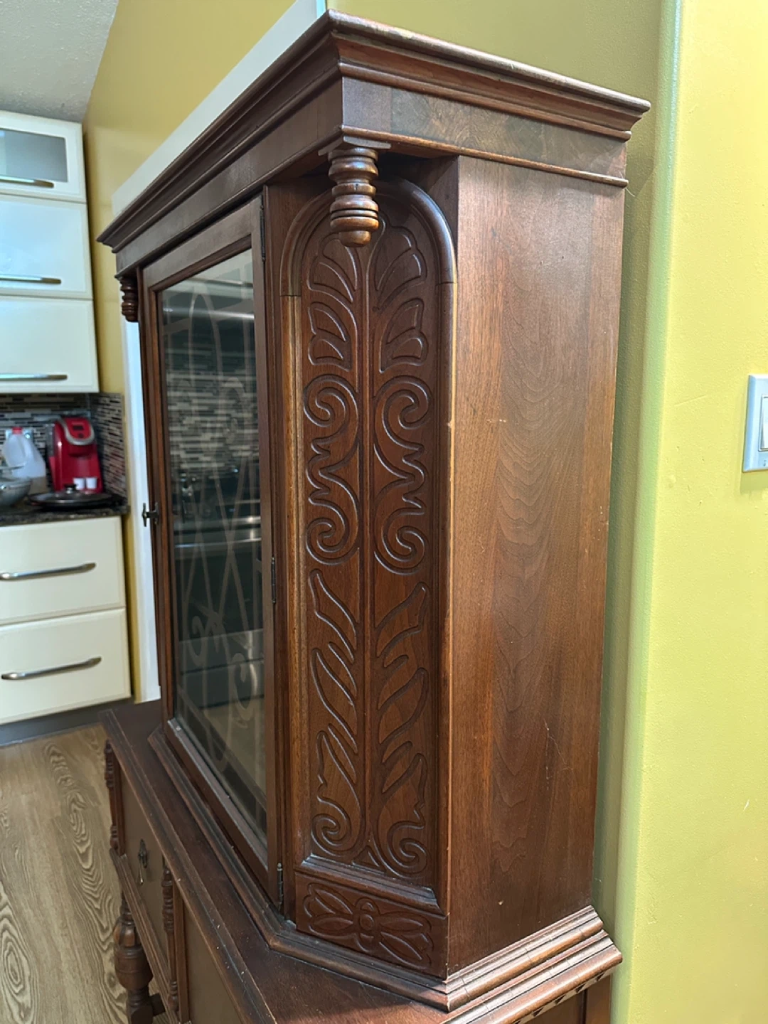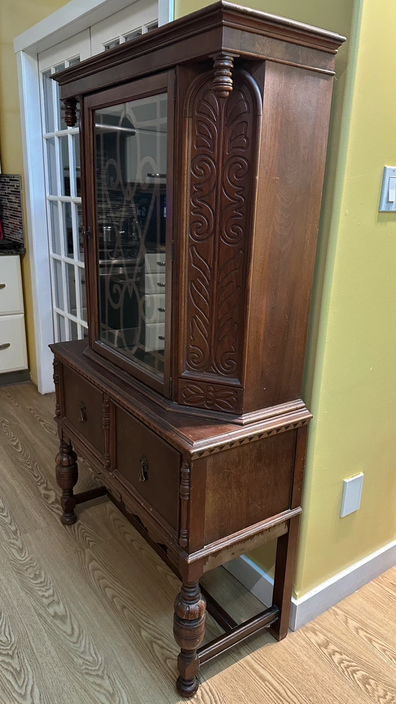 Beautifully crafted Antique china cabinet featuring rich wood tones, classic carved detailing, and a decorative leaded-style glass door. A timeless statement piece that adds warmth and sophistication to any dining room, living space, or entryway.