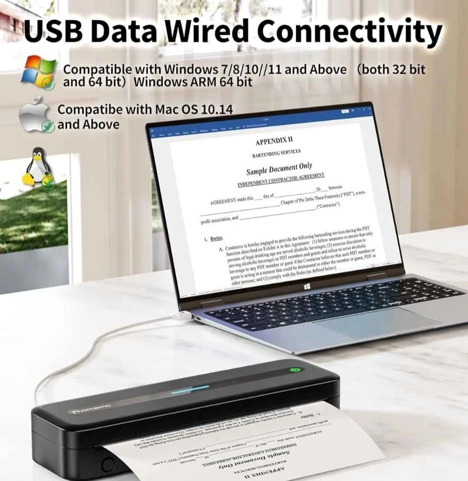 Like New Phomemo M08F Wireless Portable Printer. Looking for a compact, ink-free printing solution? This Phomemo M08F is perfect for students, business professionals, and travelers. It fits easily in a backpack and prints high-quality documents on the go. Key Features: Ink-Free Printing: Uses thermal technology, so you never have to worry about expensive ink or toner. Multi-Size Support: Compatible with US Letter, A4, and smaller thermal paper sizes. Universal Connectivity: Bluetooth: Connect seamlessly to your Smartphone or Tablet (Android/iOS). USB Wired: Connect via the included USB cable to your Laptop or PC (Windows, macOS, ChromeOS, Linux). Highly Portable: Sleek, lightweight design for "anywhere" printing. What’s Included: 1x Phomemo M08F Portable Printer. 1x Premium Protective Carrying Case (with handle). 1x USB Connection/Charging Cable (for Laptop & Phone charging). Note: Thermal paper is NOT included. Condition: Excellent / Working perfectly.