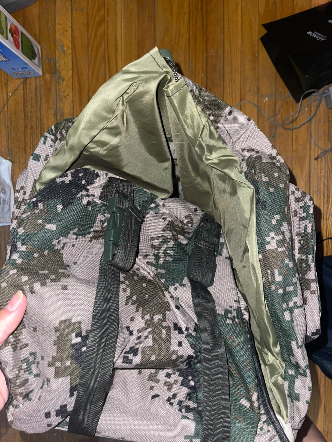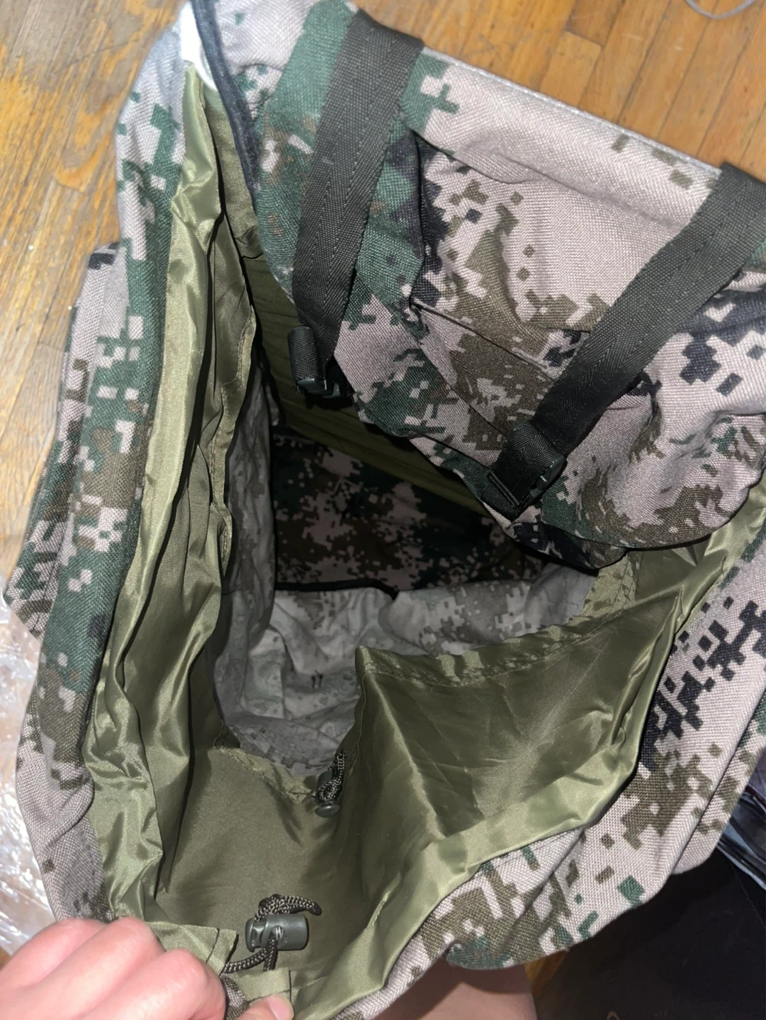 A camouflage backpack with multiple compartments. It has adjustable straps and a durable exterior.