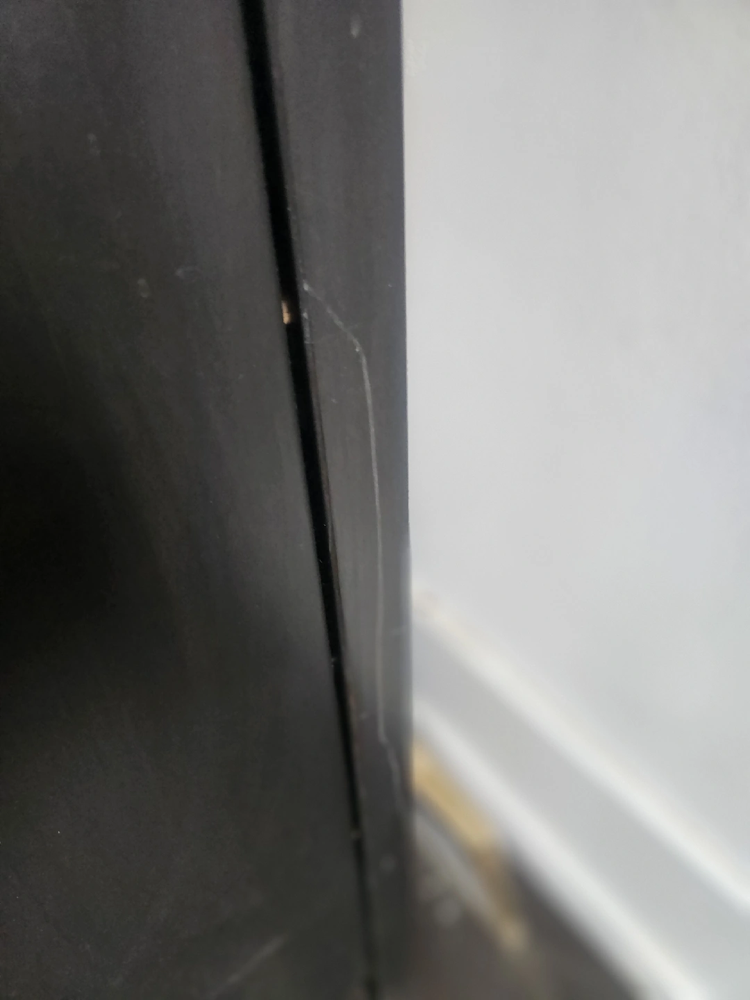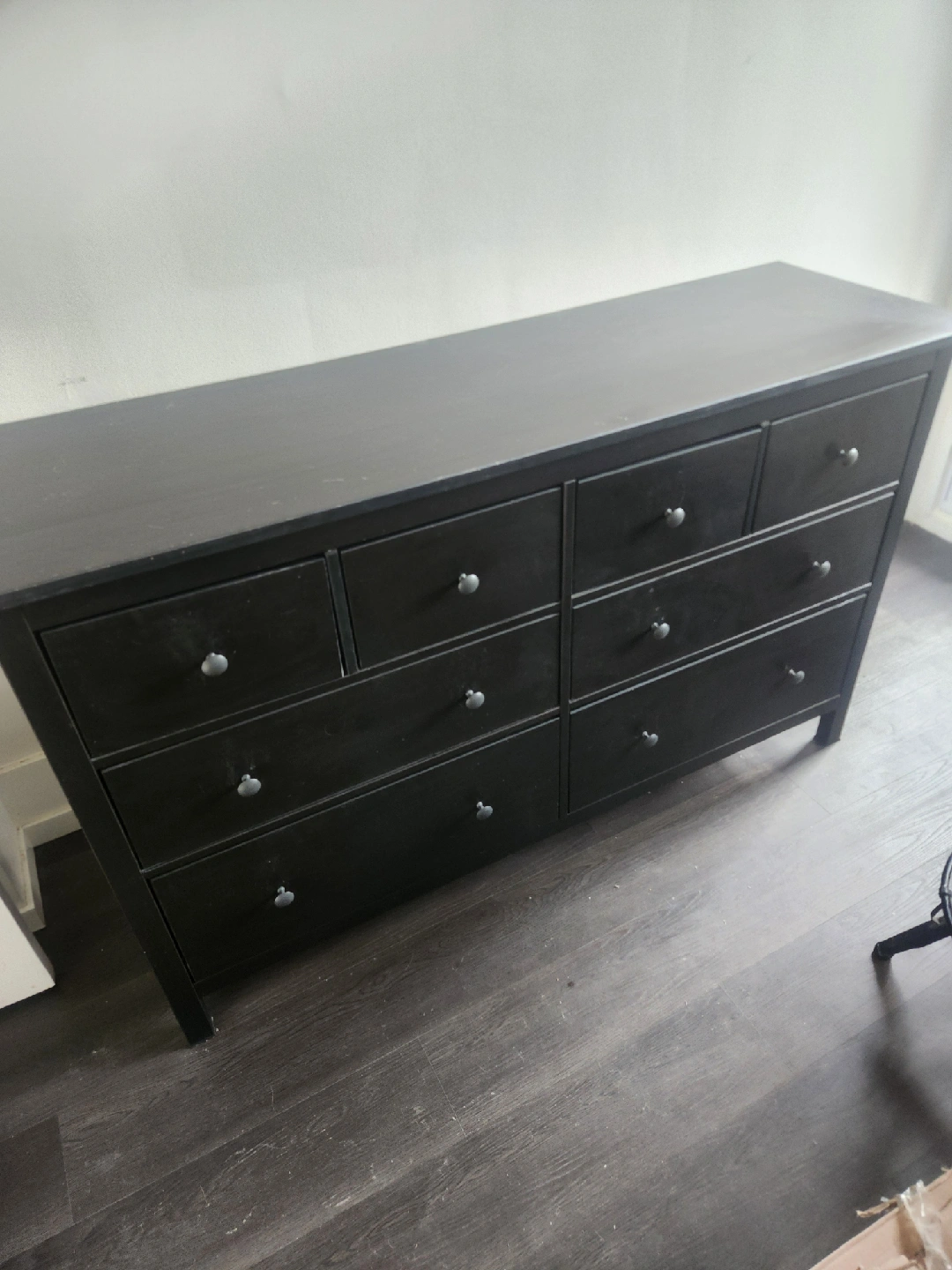 Solid wood black dresser in excellent, like-new condition with one minor scratch on the back right leg (not visible from the front – photo included). Dimensions are 5' 2.5" wide x 1' 7.5" deep x 3' 1.5" high.
