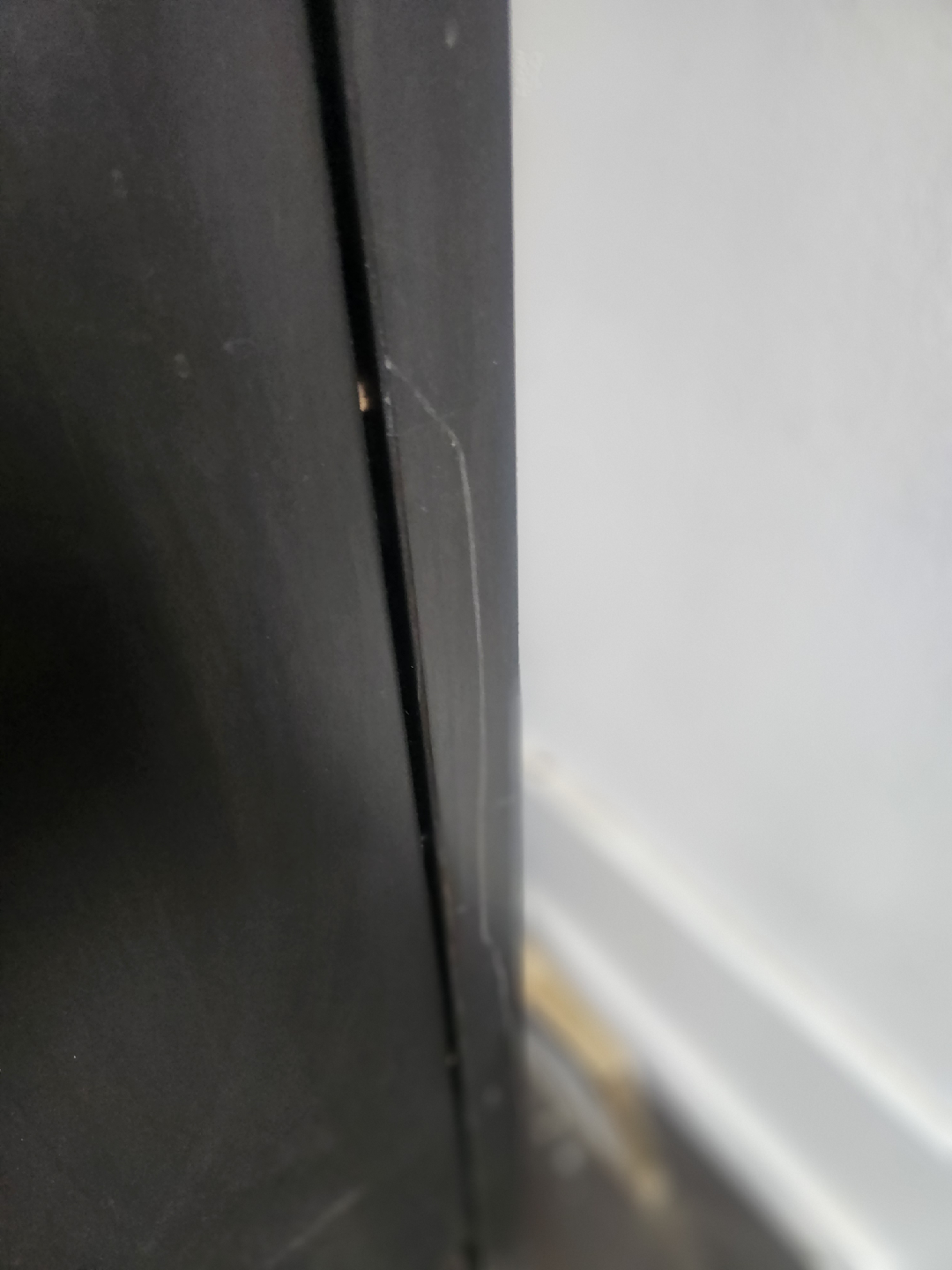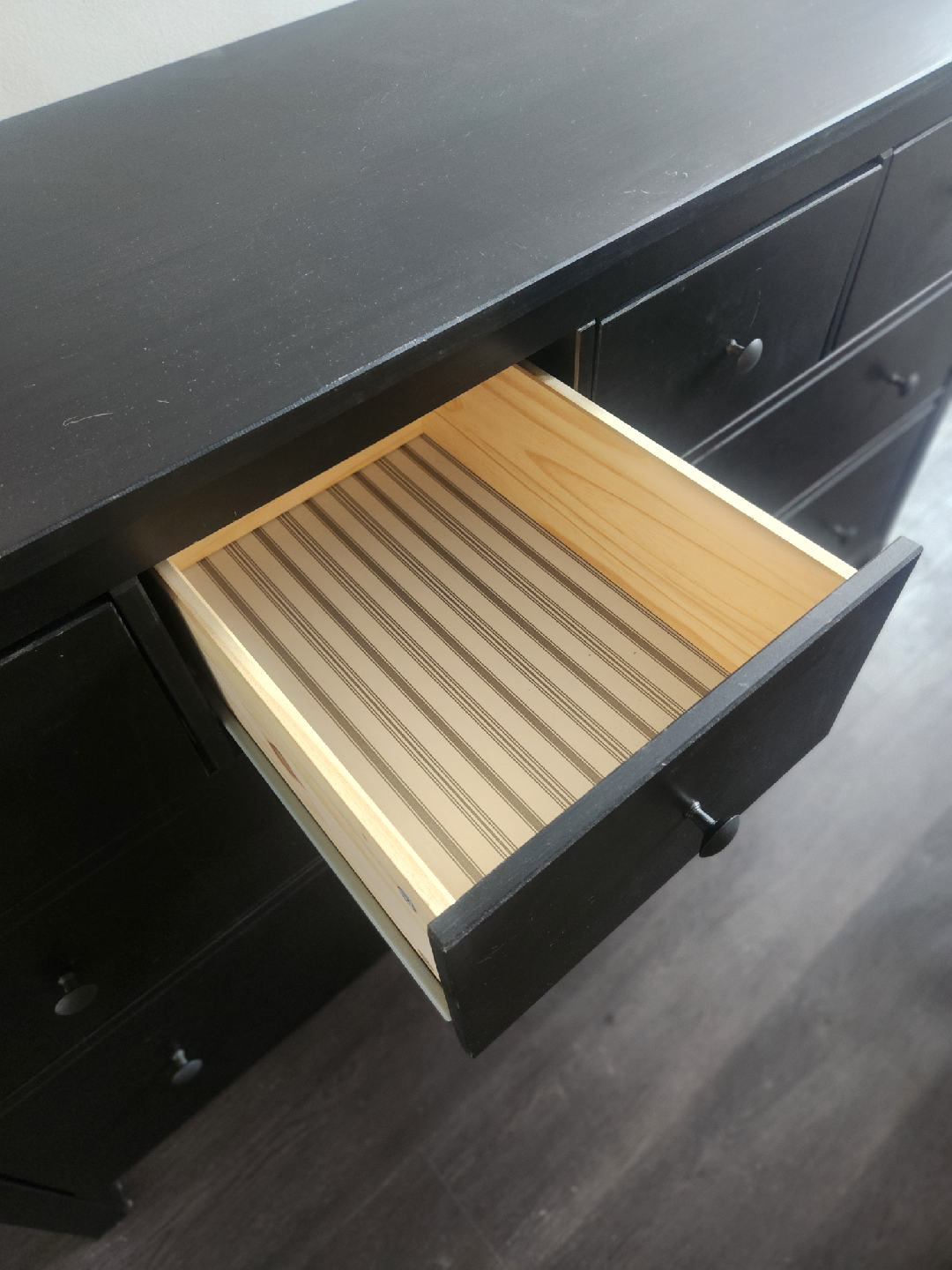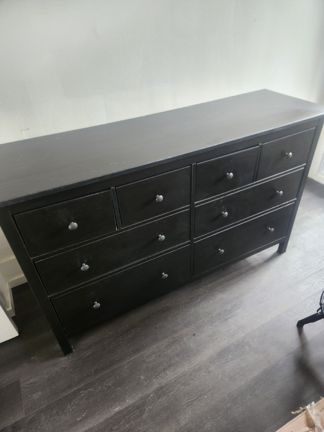 Solid wood black dresser in excellent, like-new condition with one minor scratch on the back right leg (not visible from the front – photo included). Dimensions are 5' 2.5" wide x 1' 7.5" deep x 3' 1.5" high.