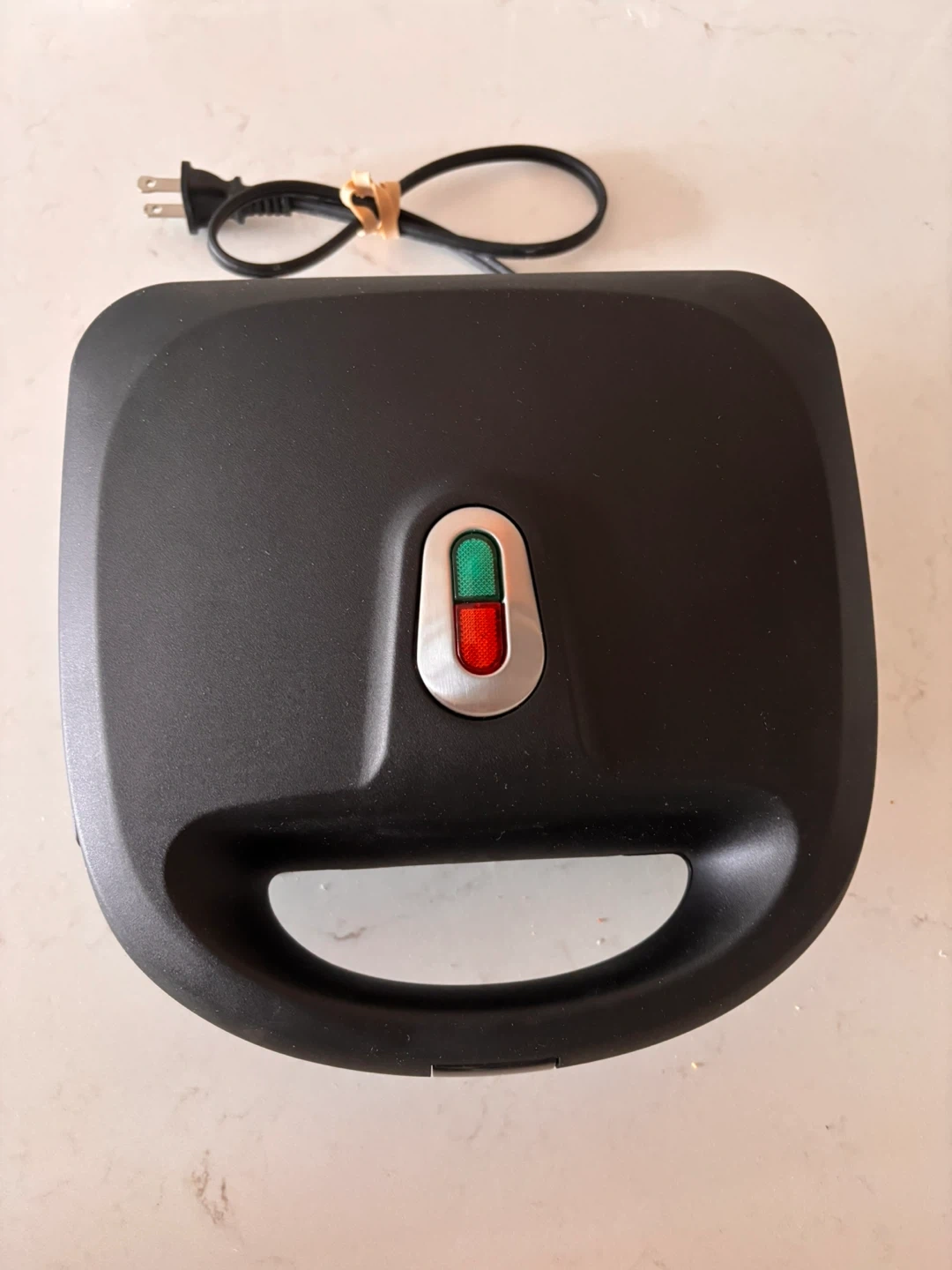 Compact electric waffle maker that’s easy to use and perfect for making waffles or sandwiches at home. Includes interchangeable plates for waffles and sandwiches, heating evenly for quick results