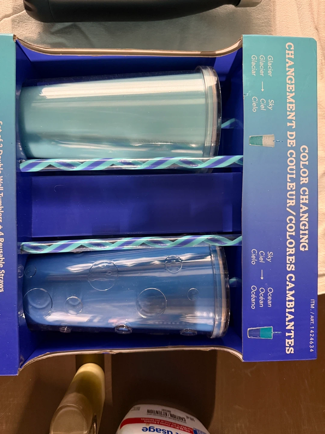 These colour changing tumblers change colour when ice is added. They're double-walled and come with reusable straws. Includes two tumblers and two straws.