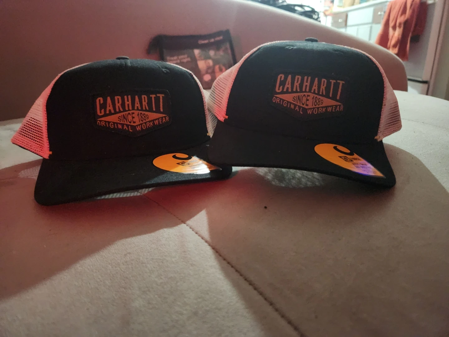 Two Carhartt trucker hats are up for grabs! These black caps feature the iconic Carhartt logo patch and a pink mesh back. They're perfect for everyday wear or while working outdoors. Selling 10 each or 2 for 30