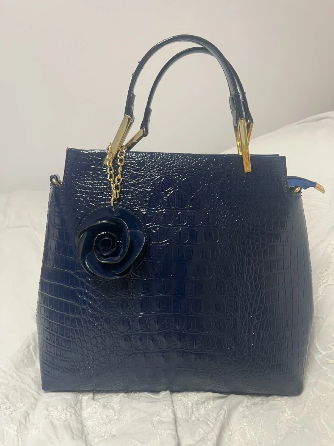 This navy blue handbag features a stylish crocodile embossed texture. It comes with a detachable shoulder strap and a decorative rose charm. Interior is lined. Pick up cash only