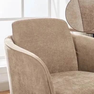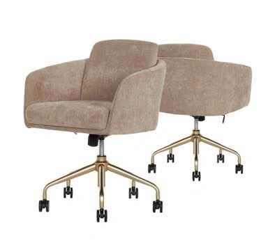 Brand new in box. Modern upholstered swivel office chair with adjustable height, curved arms, plush seating, and gold-tone rolling base. Can be used as a vanity chair as well.