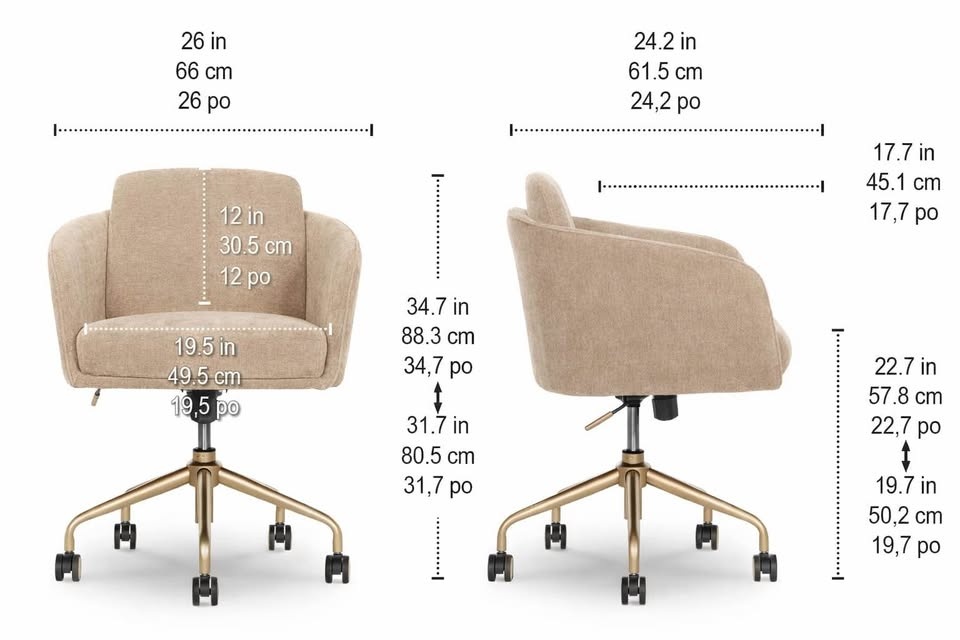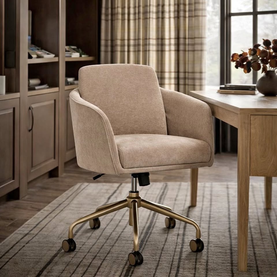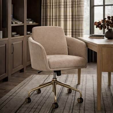 Brand new in box. Modern upholstered swivel office chair with adjustable height, curved arms, plush seating, and gold-tone rolling base. Can be used as a vanity chair as well.