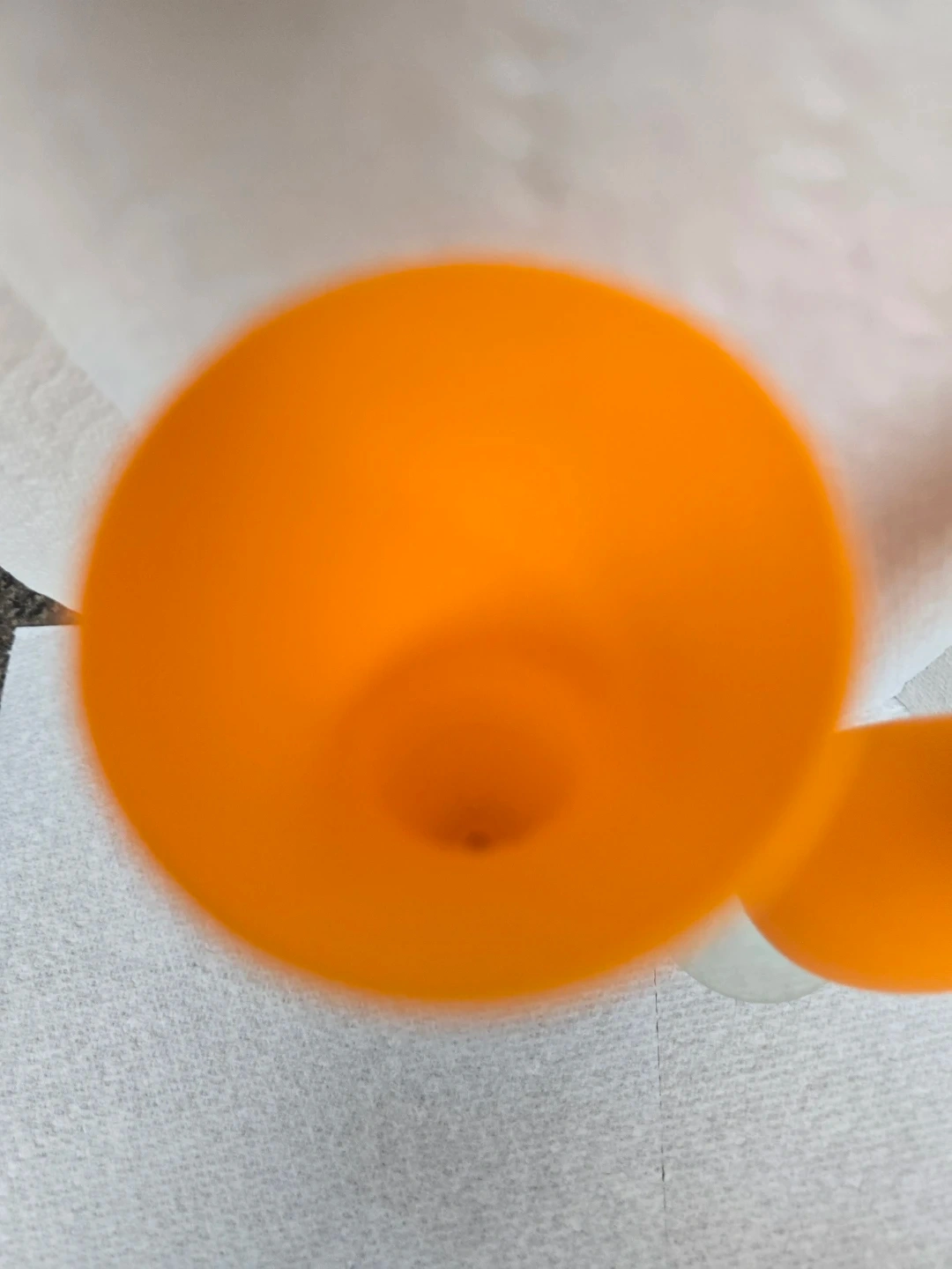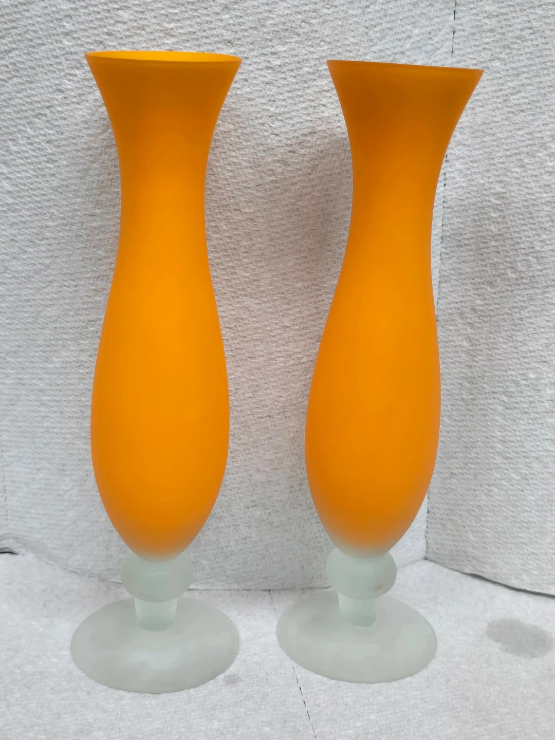 Selling a set of two vibrant orange glass vases! They have a unique shape and a frosted glass base. Perfect for adding a pop of colour to your home decor