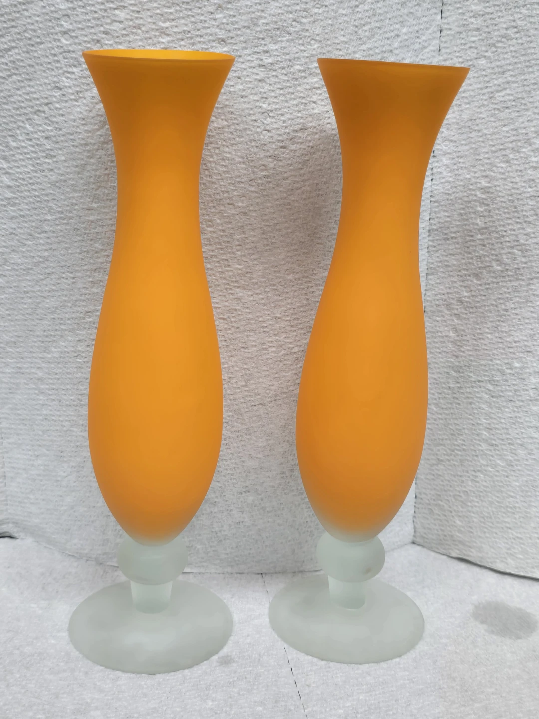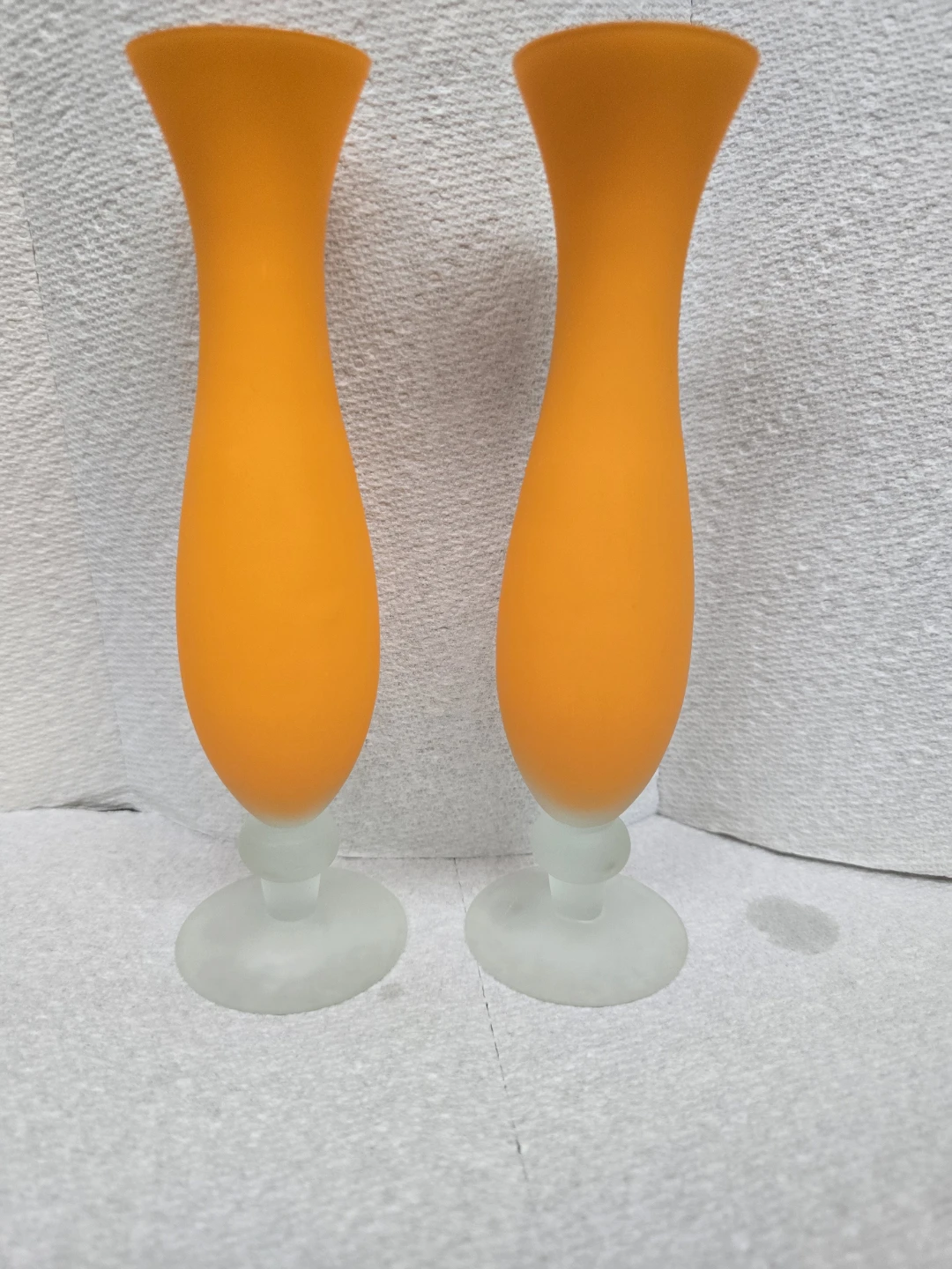 Selling a set of two vibrant orange glass vases! They have a unique shape and a frosted glass base. Perfect for adding a pop of colour to your home decor