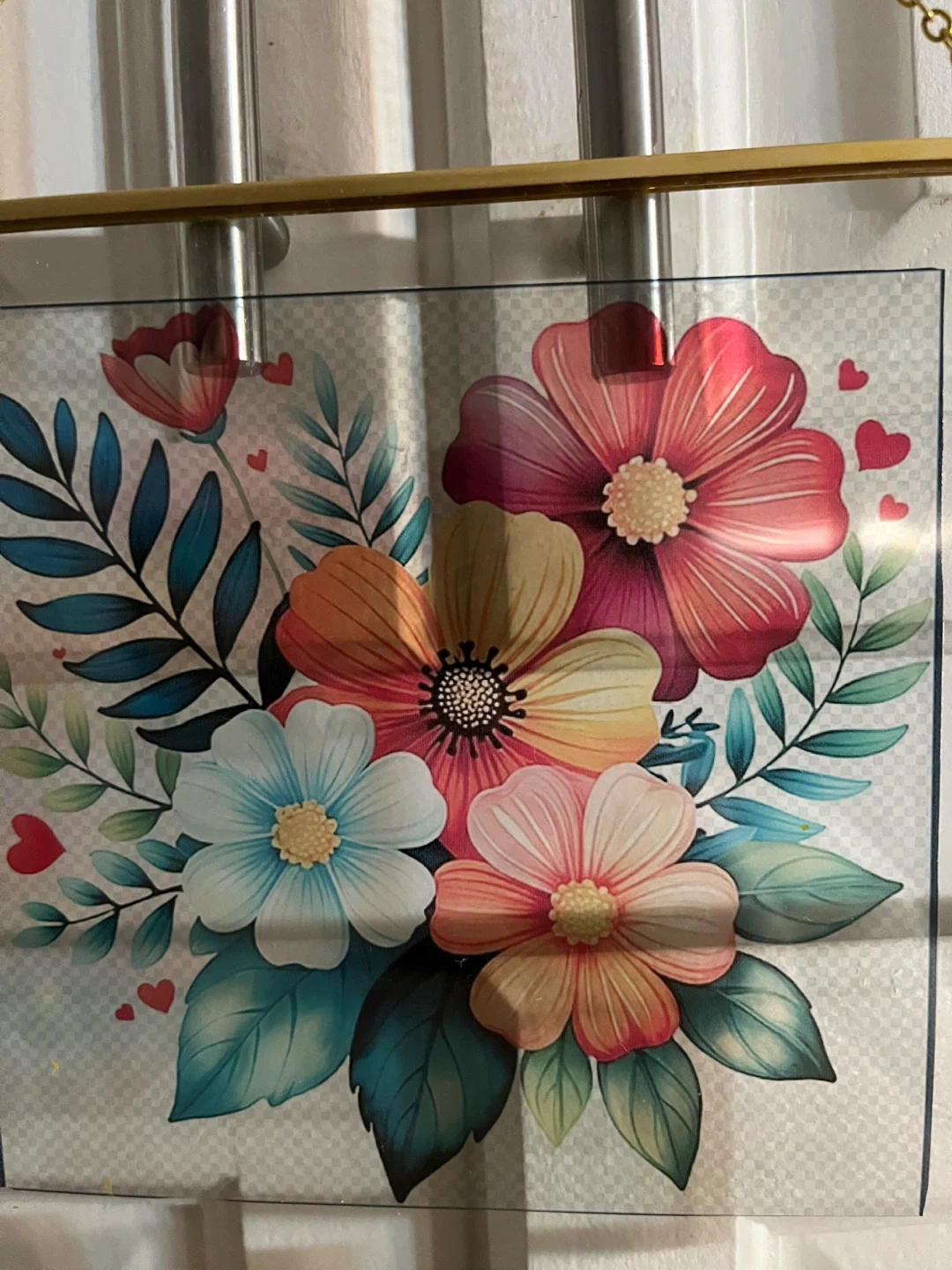 This decorative frame features a vibrant floral print behind glass. It's encased in a gold-tone metal frame with a hanging chain. Great for adding a pop of color to any room!