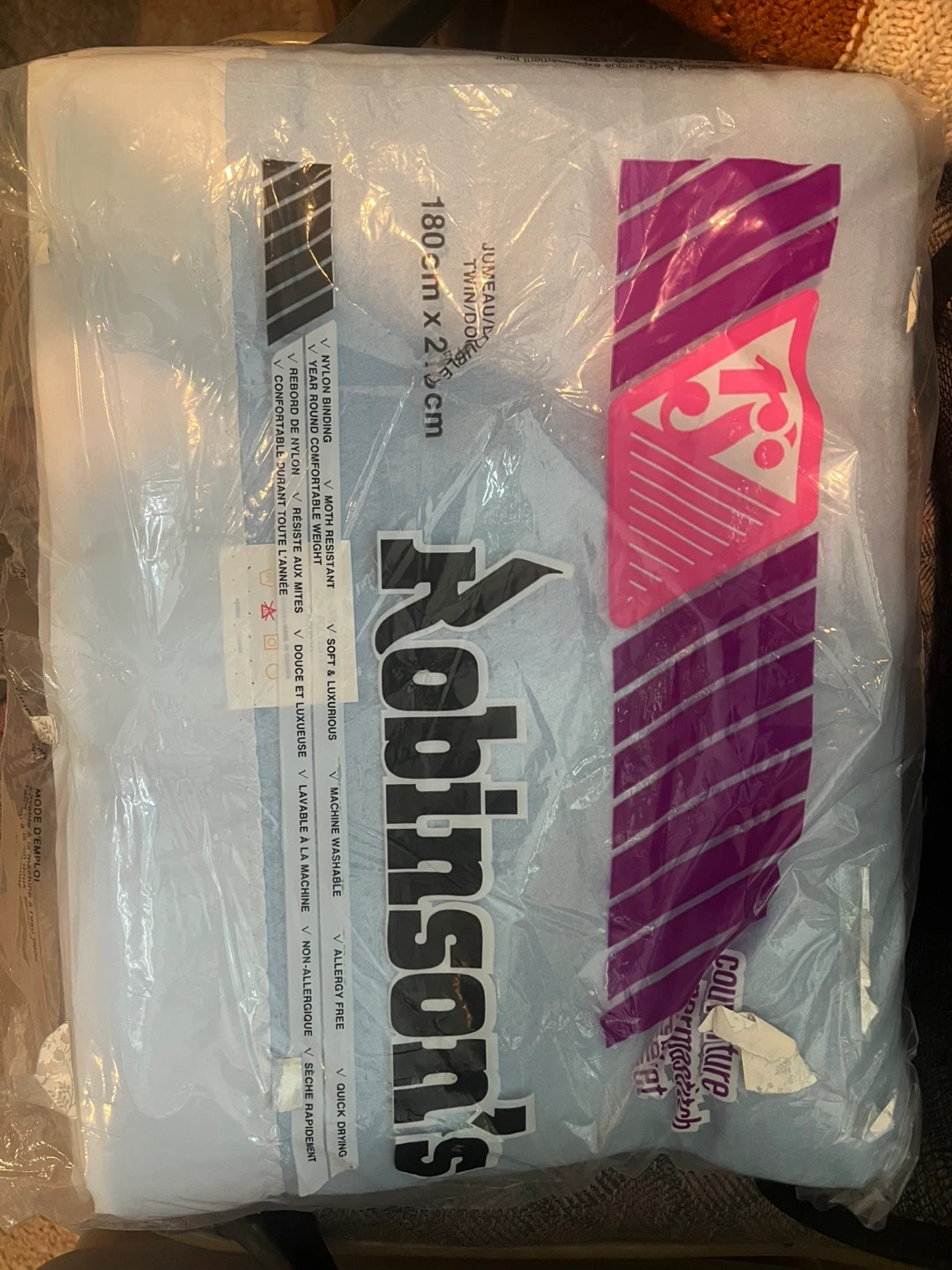 Selling a brand new Robinson's twin/double blanket still in its original packaging! It's 180cm x 2.5cm. This blanket features nylon binding and is moth resistant. It's also soft and luxurious, machine washable, allergy-free, and quick drying, ensuring comfort all year round