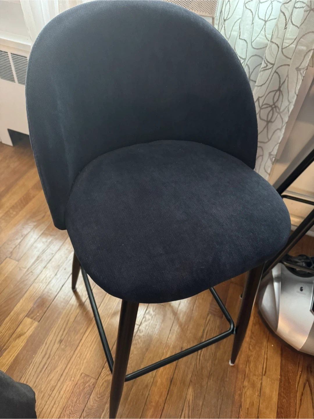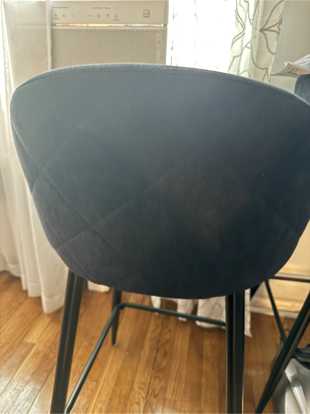 Selling a set of 2 bar stools in navy blue! It's a modern PU barstool with a back and footrest. The height is 37.8 inches, perfect for a pub, home bar, dining room, or kitchen. The dimensions are visible in the screenshots!