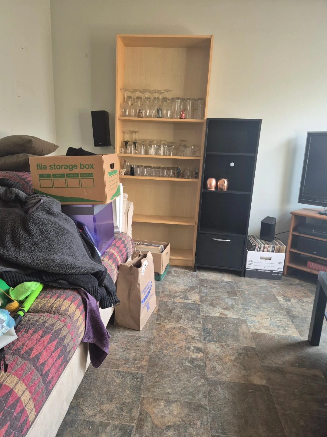 Tall black shelf unit with three open shelves and one drawer at the bottom. It's made of composite wood and has a modern, clean design. This unit offers versatile storage for books, decor, or other household items. Needs to be picked up.