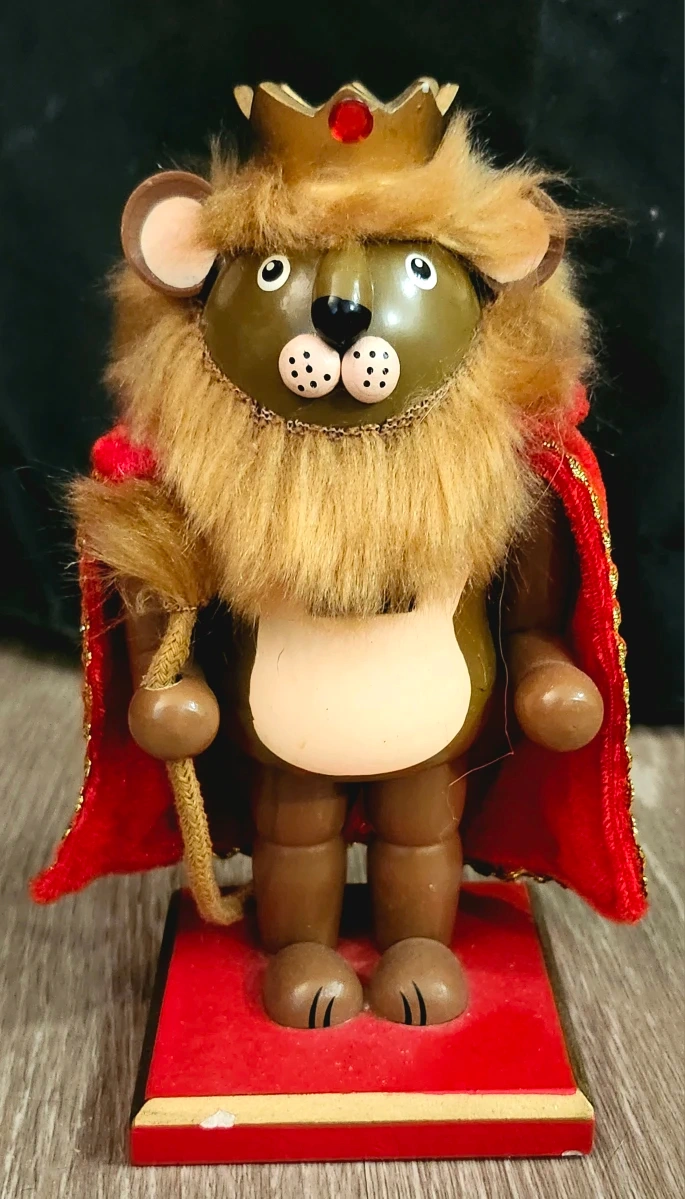This decorative Cowardly Lion Nutcracker is ready to guard your home and add a regal flair to your holiday decorations. It stands approximately 7 inches tall. The Cowardly Lion Nutcracker is in good condition, ready to bring a touch of royalty to your decor.