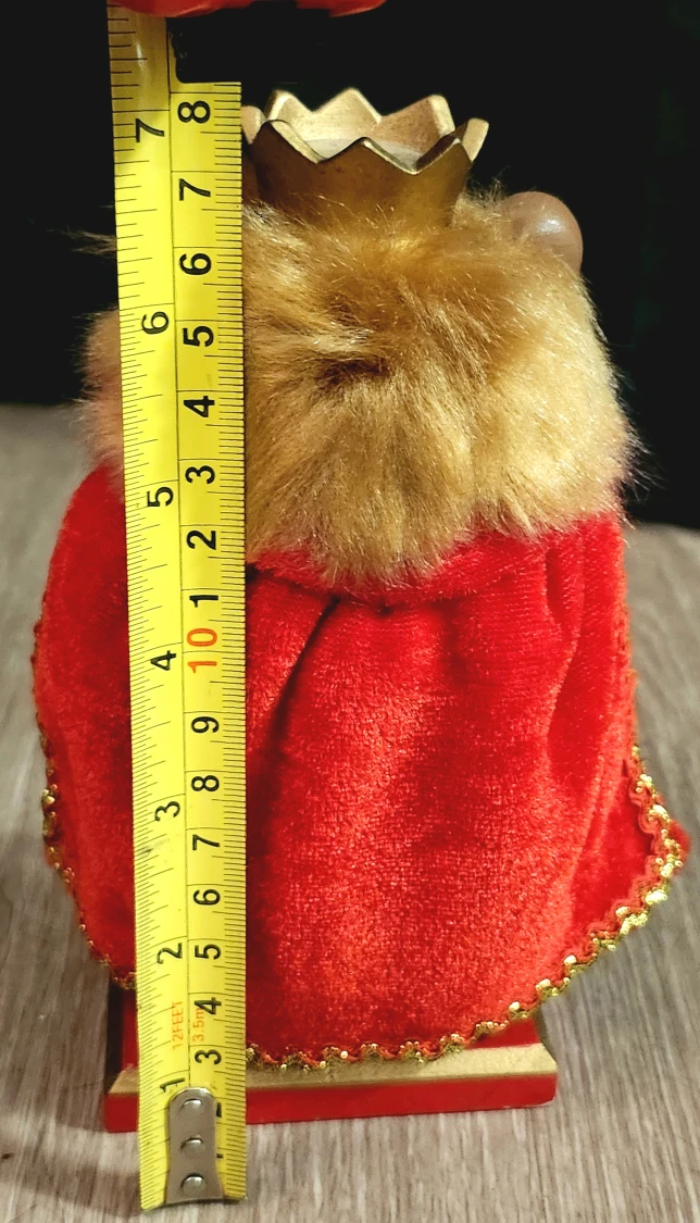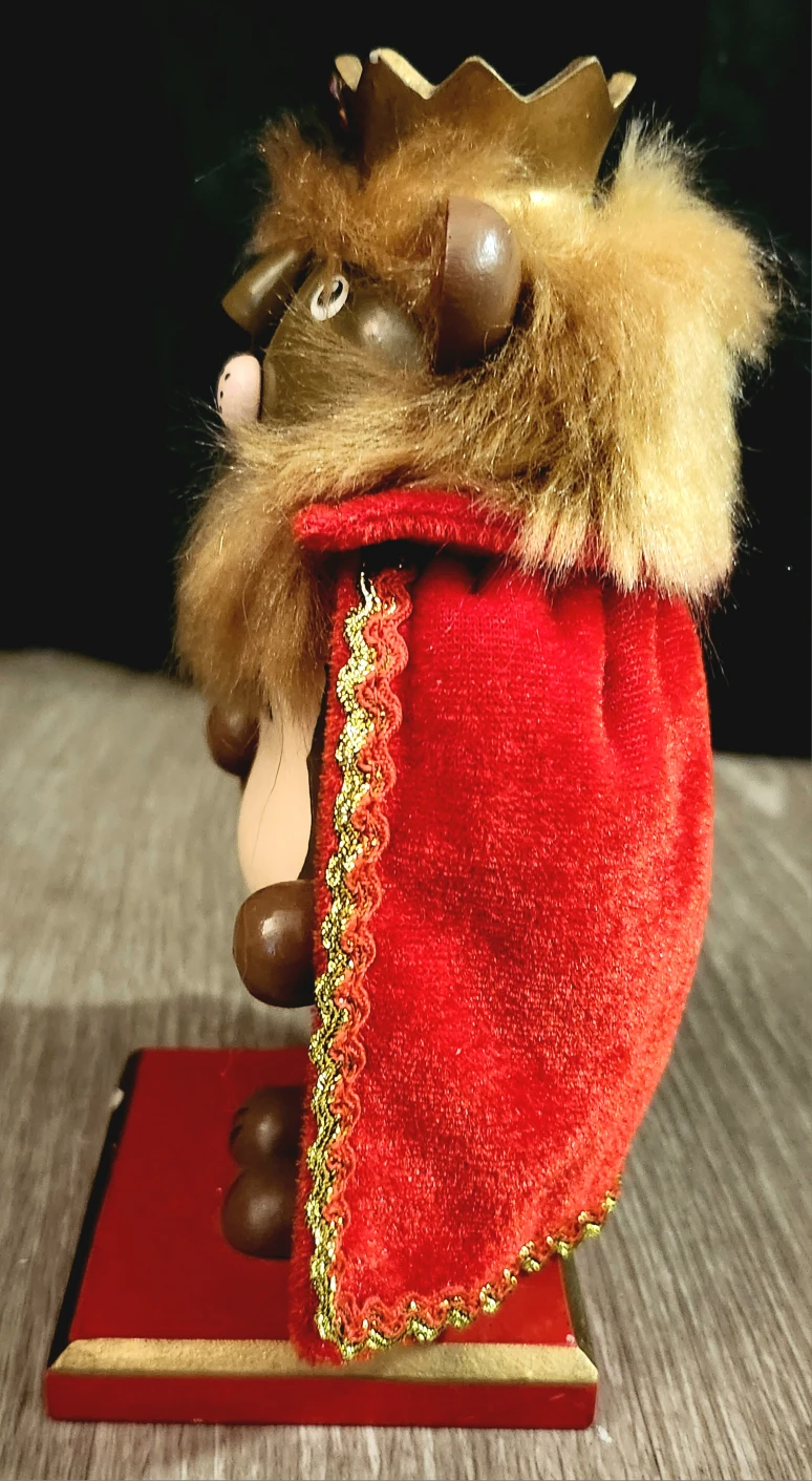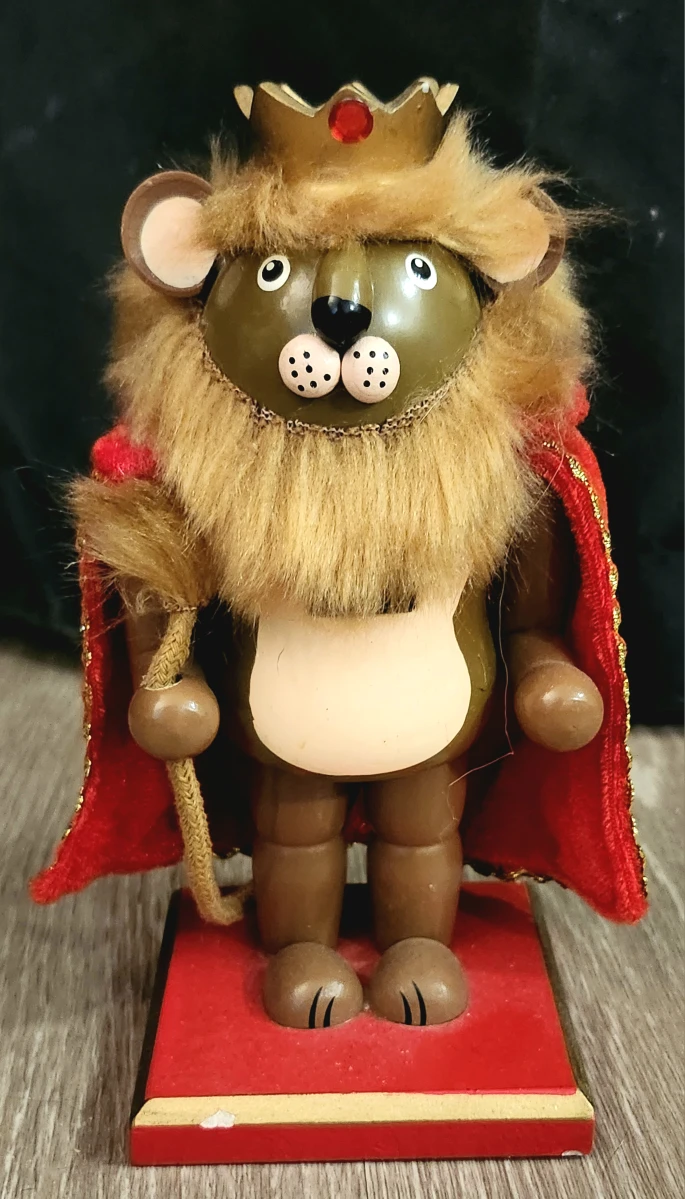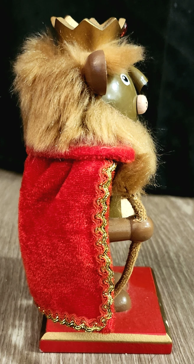 This decorative Cowardly Lion Nutcracker is ready to guard your home and add a regal flair to your holiday decorations. It stands approximately 7 inches tall. The Cowardly Lion Nutcracker is in good condition, ready to bring a touch of royalty to your decor.