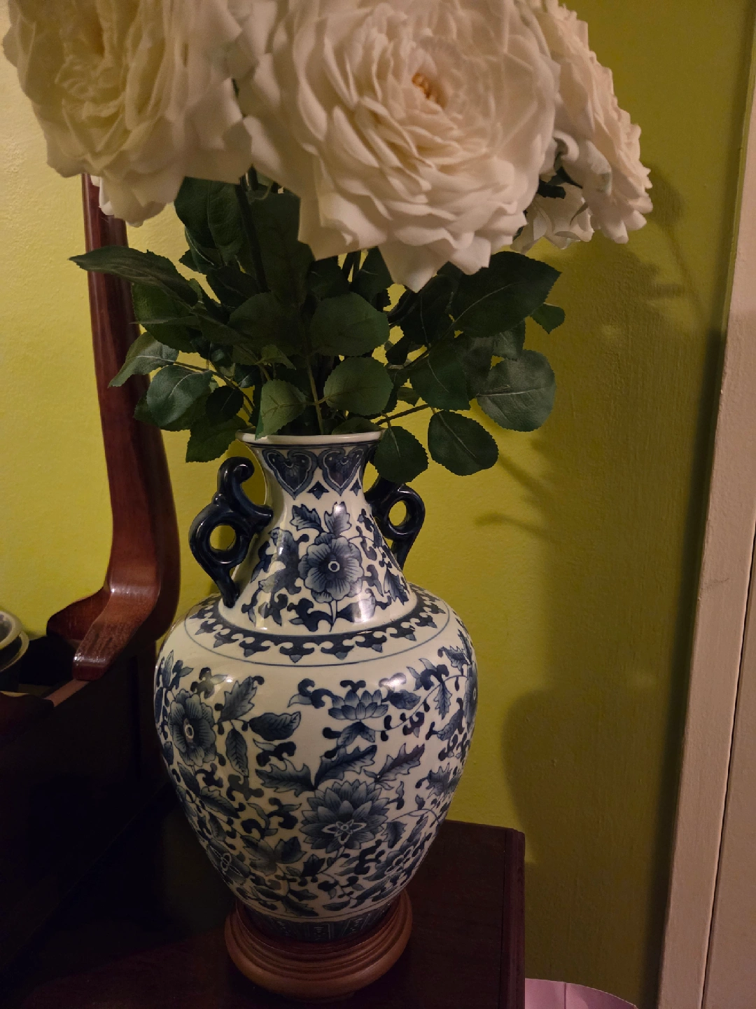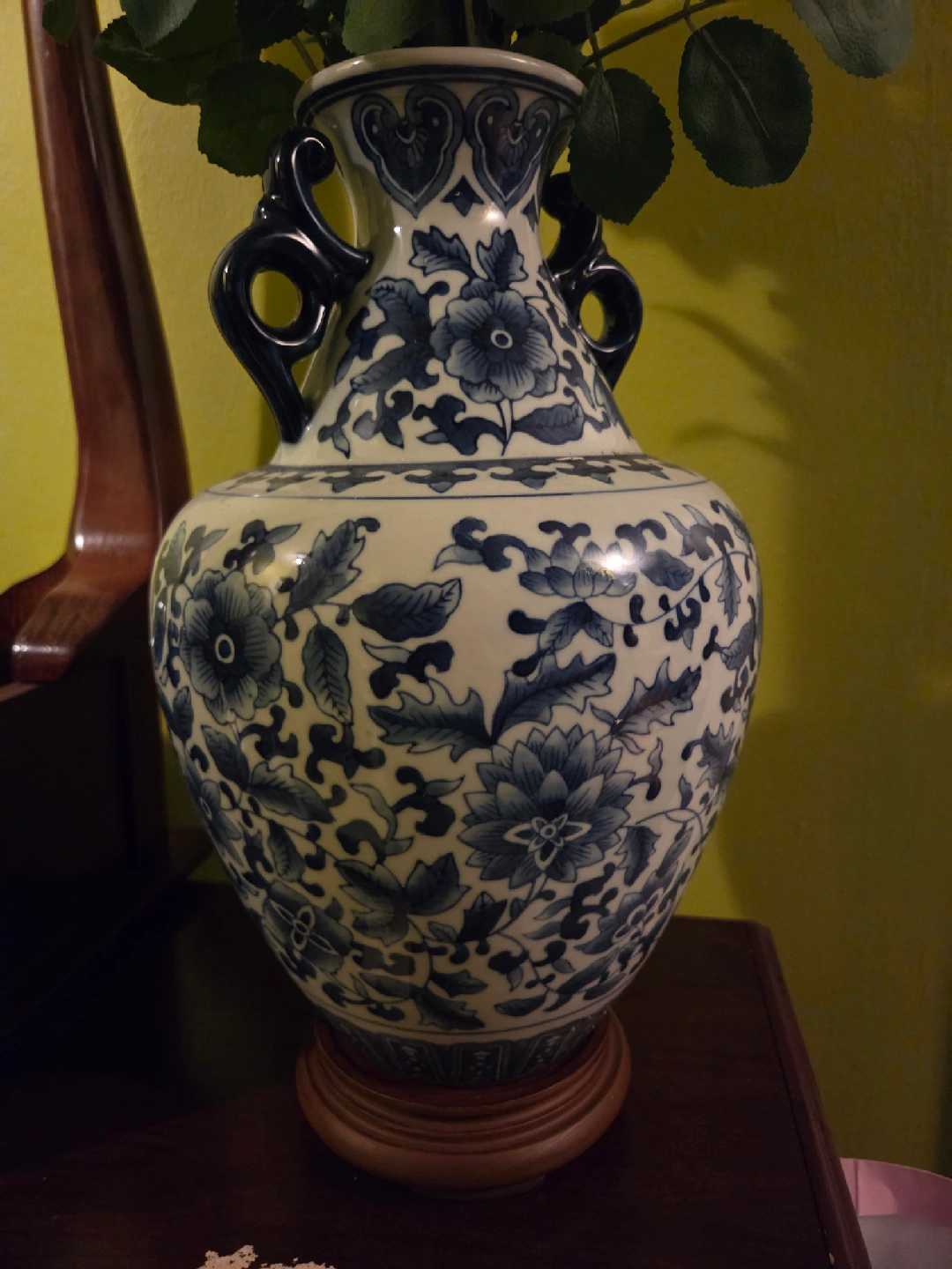 Beautiful vase with a blue floral design and handles. It's in great condition and would look lovely with flowers or as a decorative piece on its own