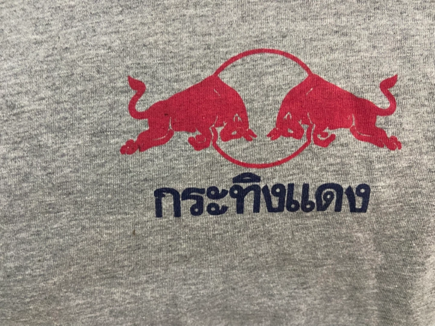 This is a grey t-shirt with navy blue raglan sleeves. It features the iconic Red Bull logo on the front and back, along with Thai lettering underneath. The shirt's material appears to be a cotton blend.