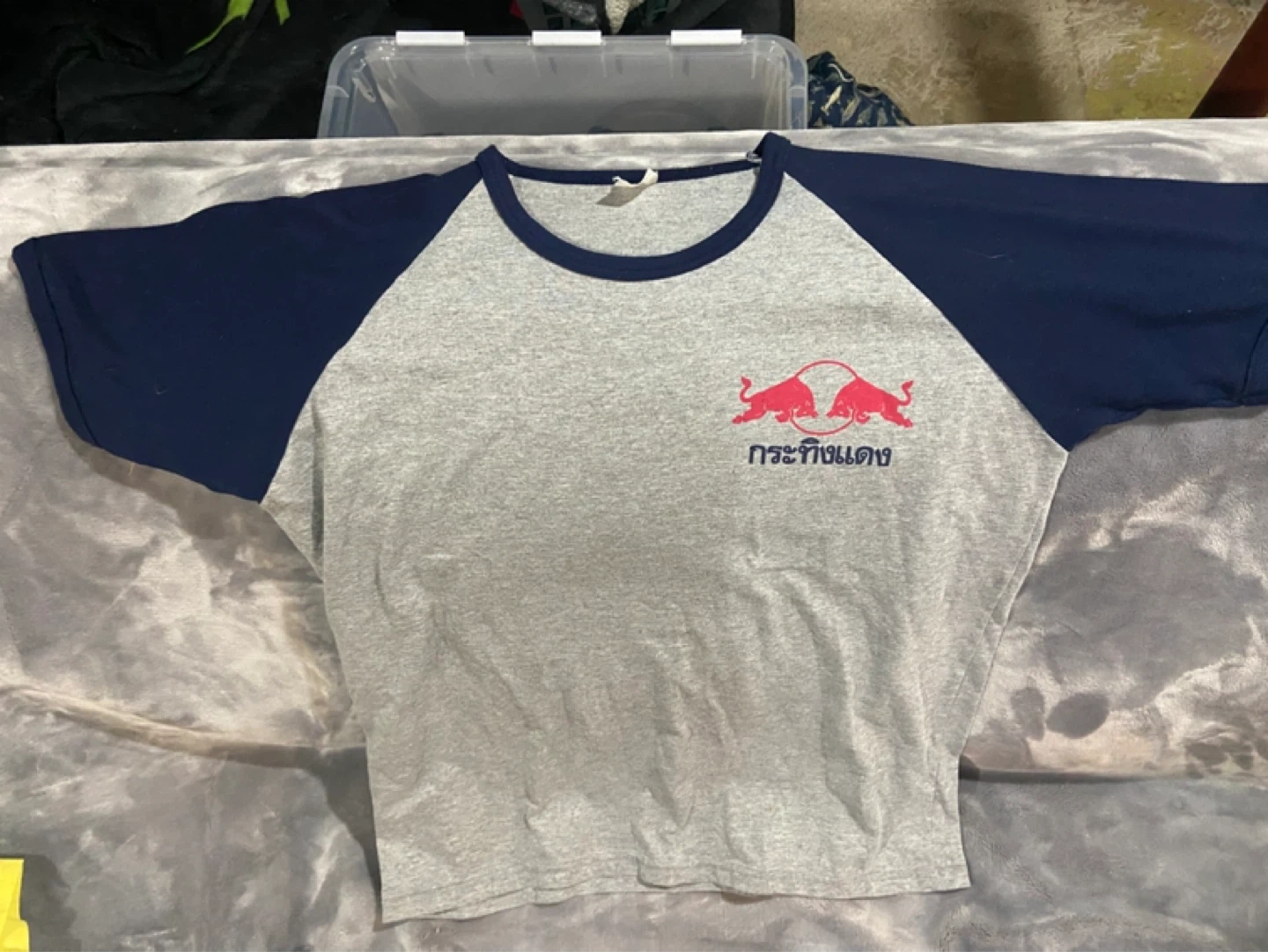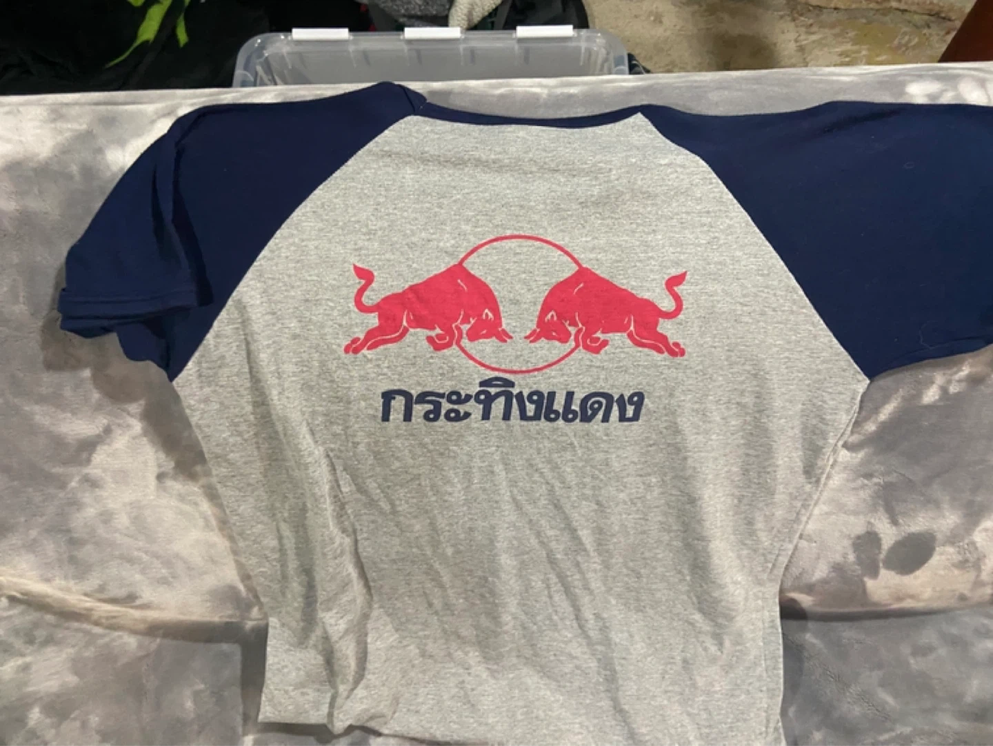 This is a grey t-shirt with navy blue raglan sleeves. It features the iconic Red Bull logo on the front and back, along with Thai lettering underneath. The shirt's material appears to be a cotton blend.
