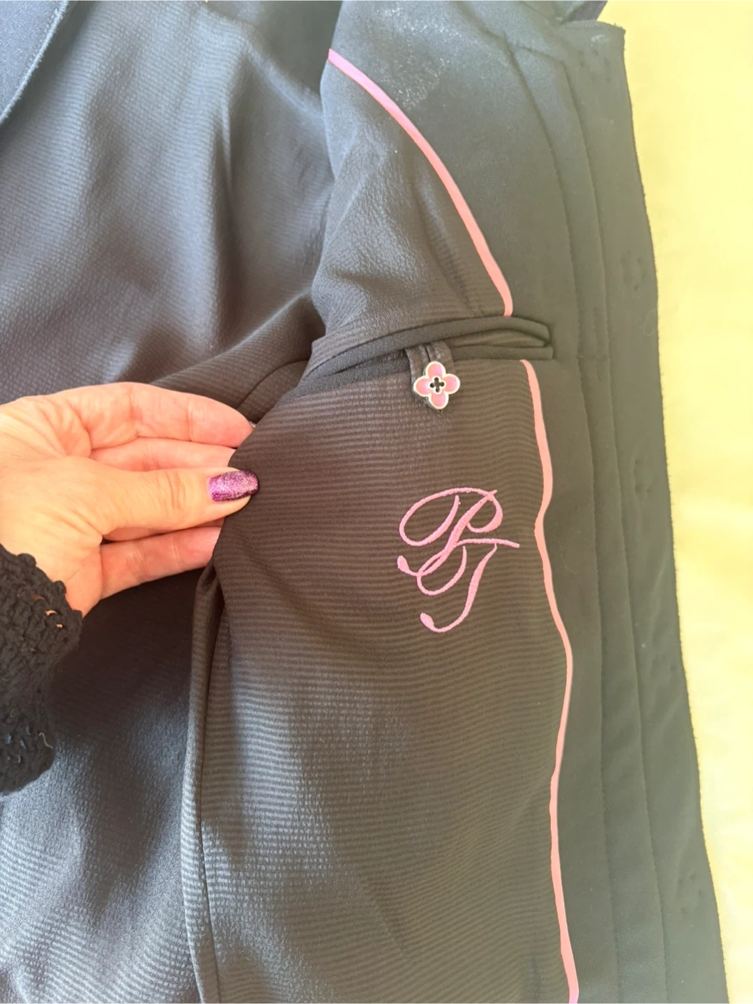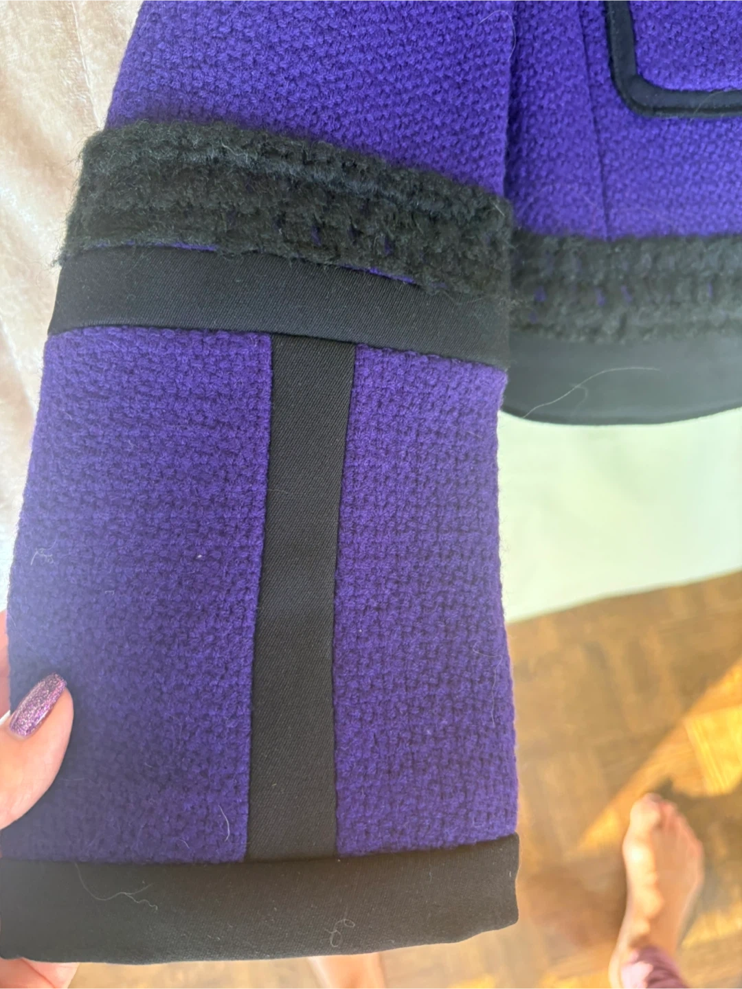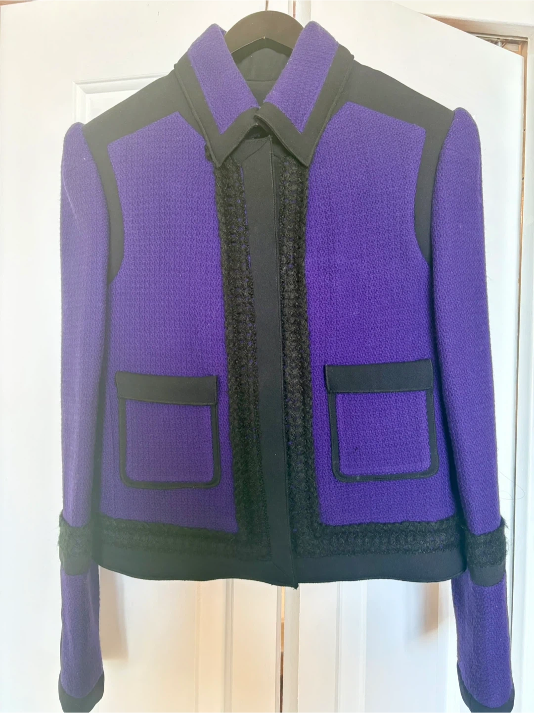 Elegant purple women’s suit in like new condition. Striking rich colour and texture, bold structure and sophisticated detailing with black accents. Exudes business-like femininity.