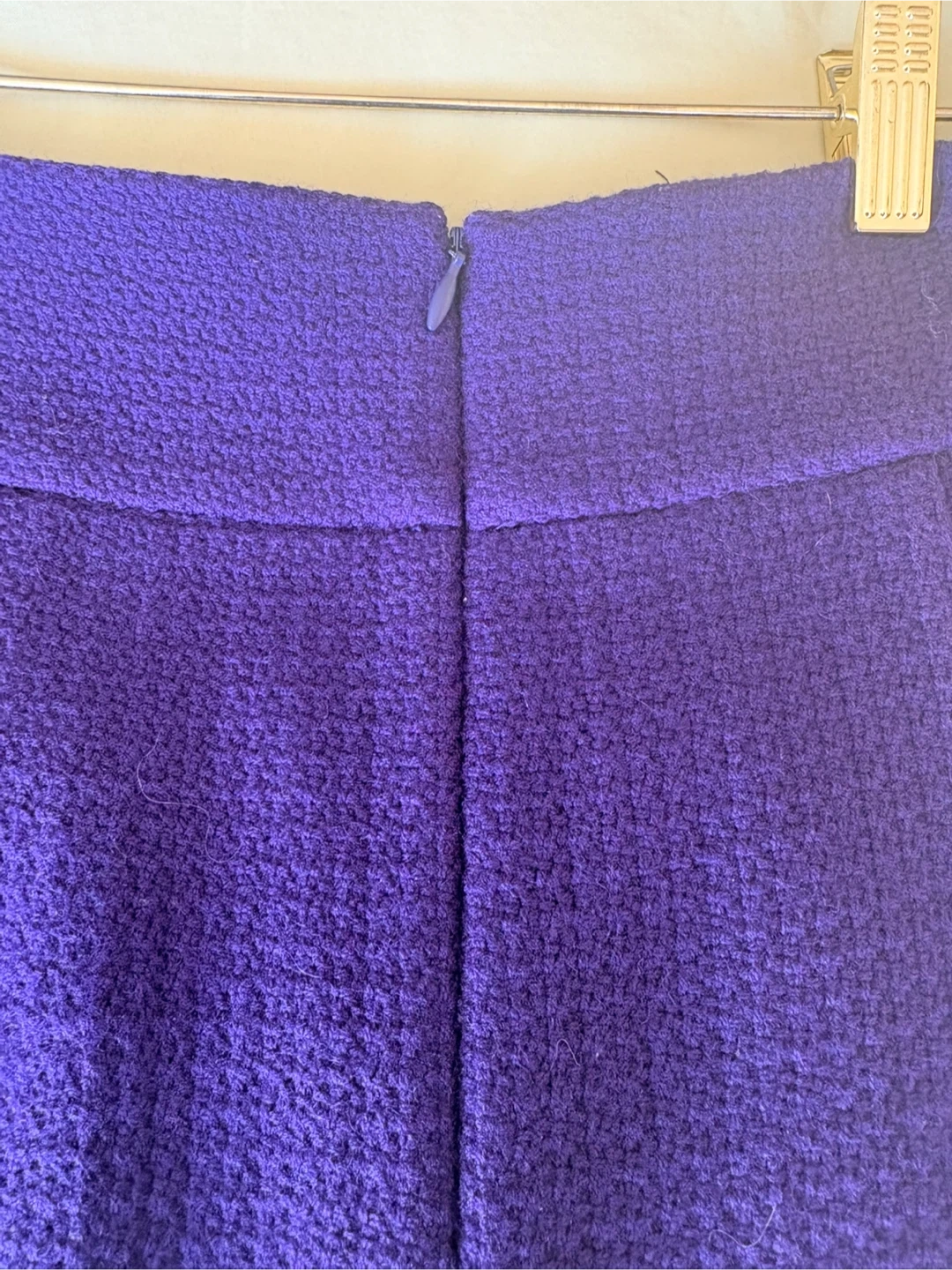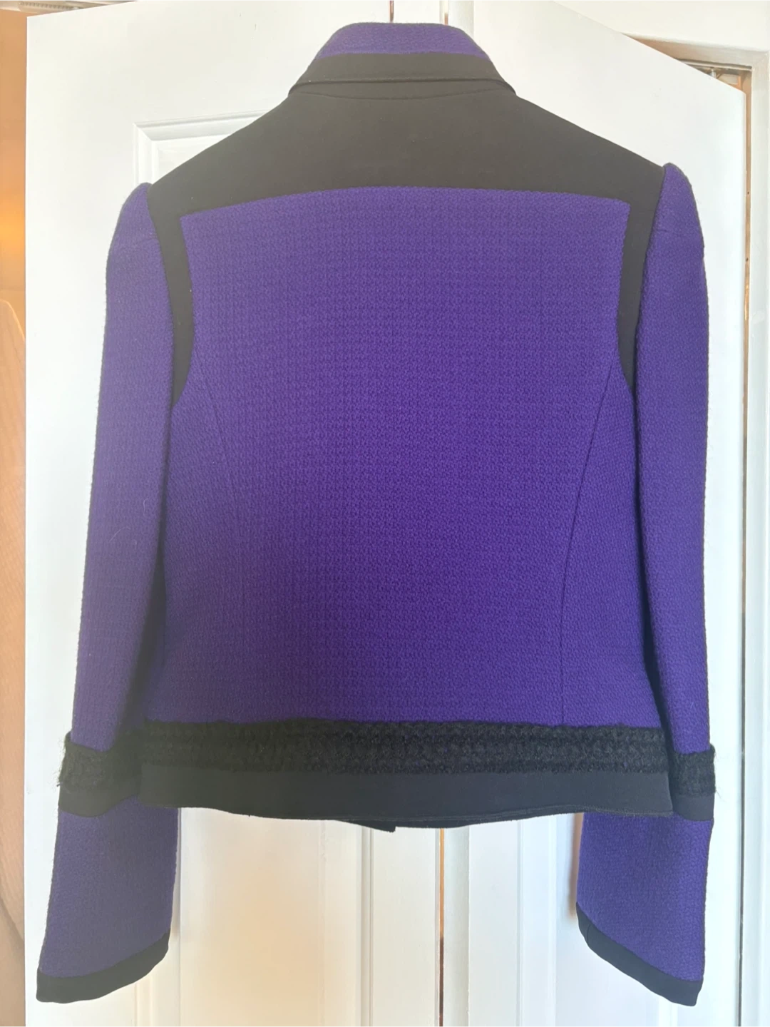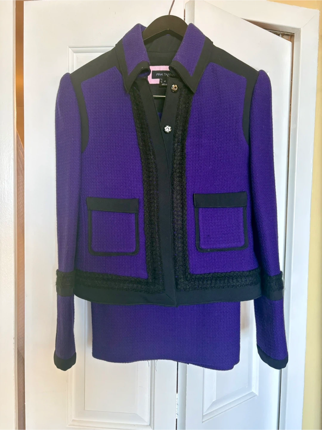 Elegant purple women’s suit in like new condition. Striking rich colour and texture, bold structure and sophisticated detailing with black accents. Exudes business-like femininity.