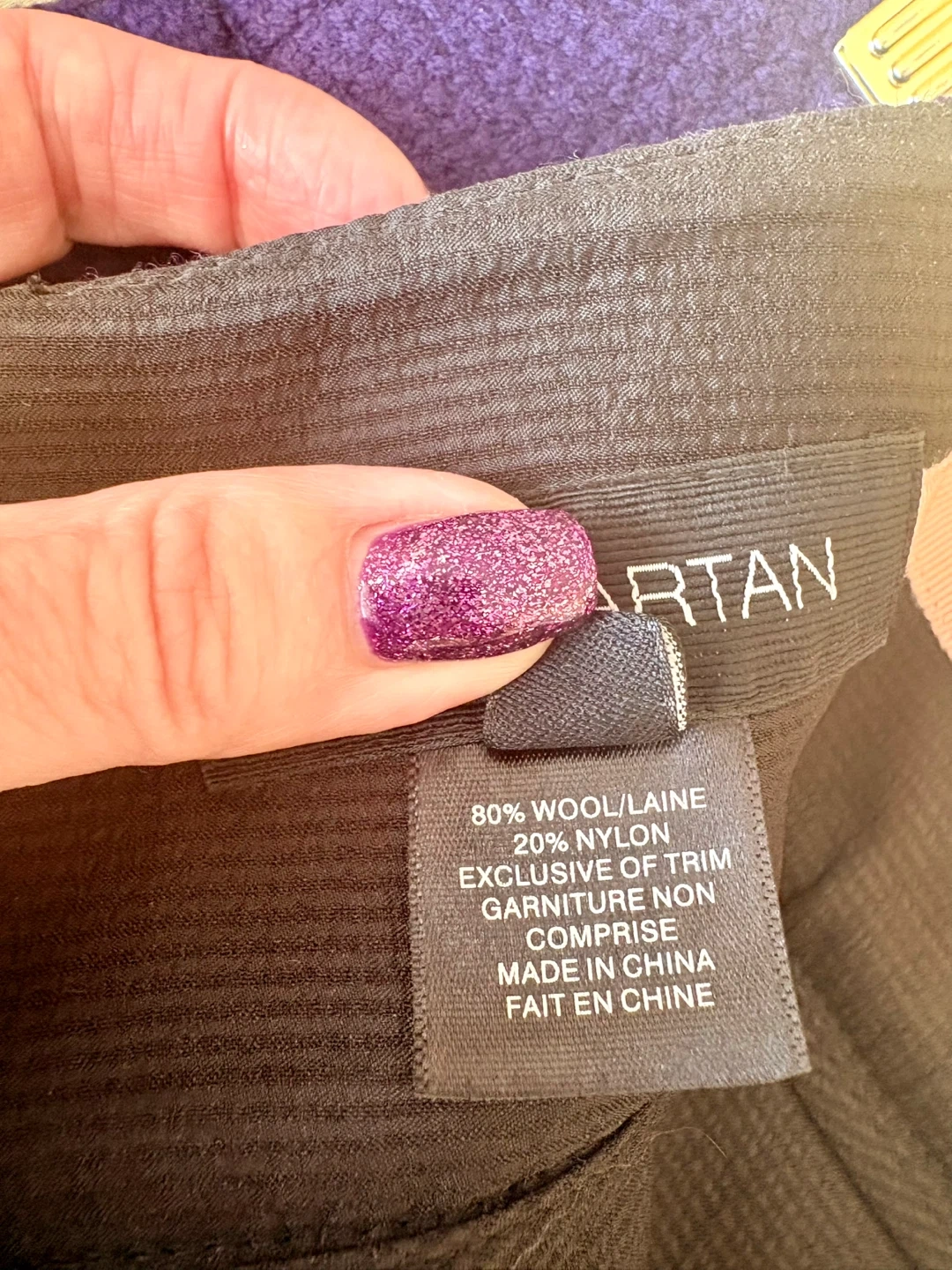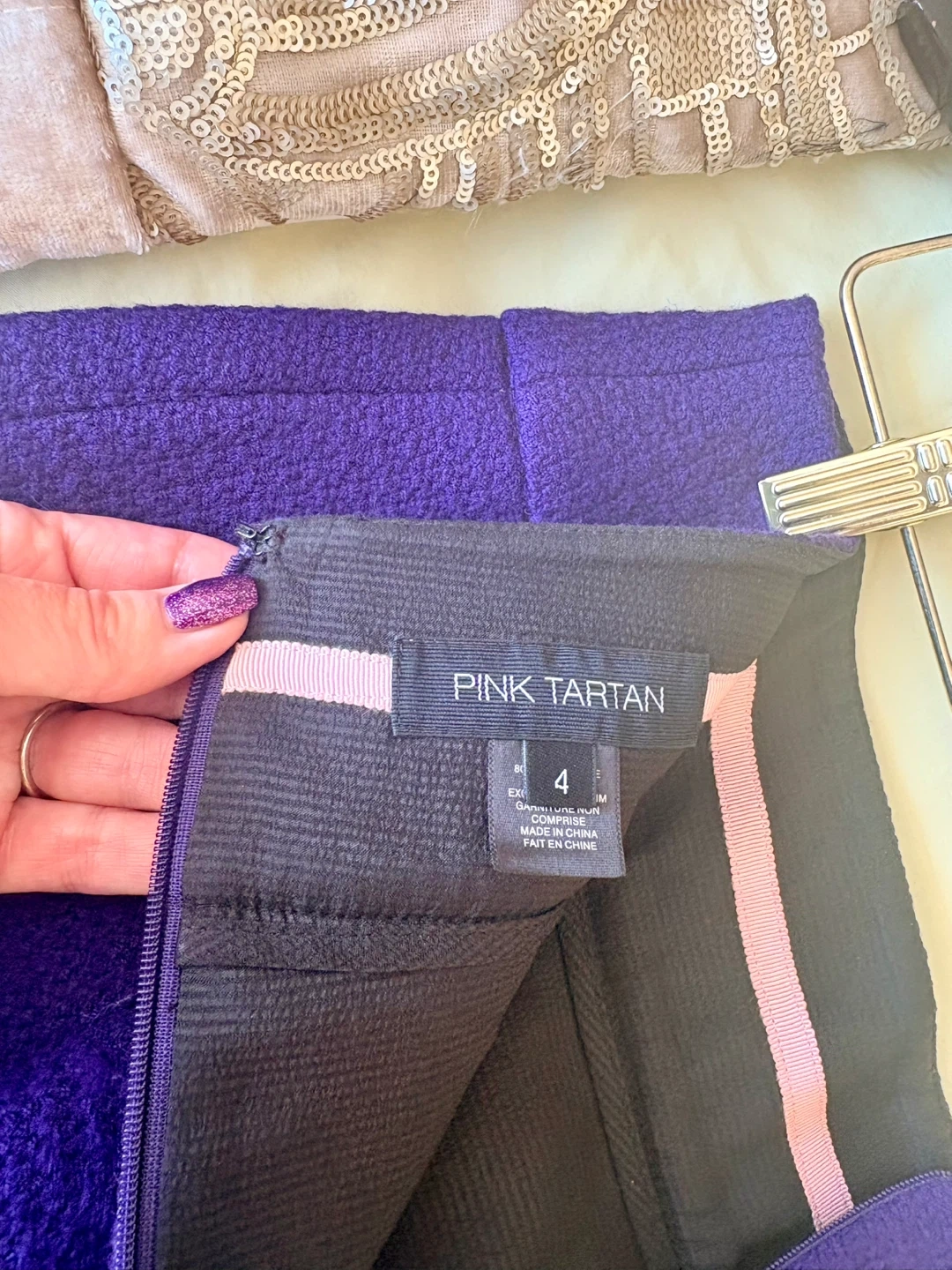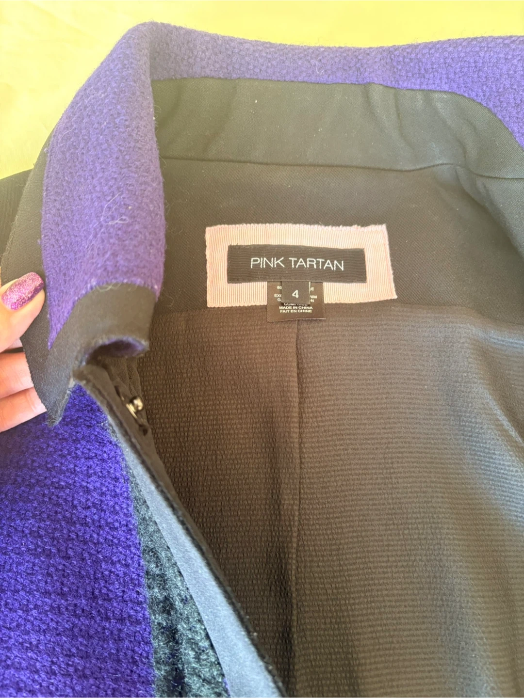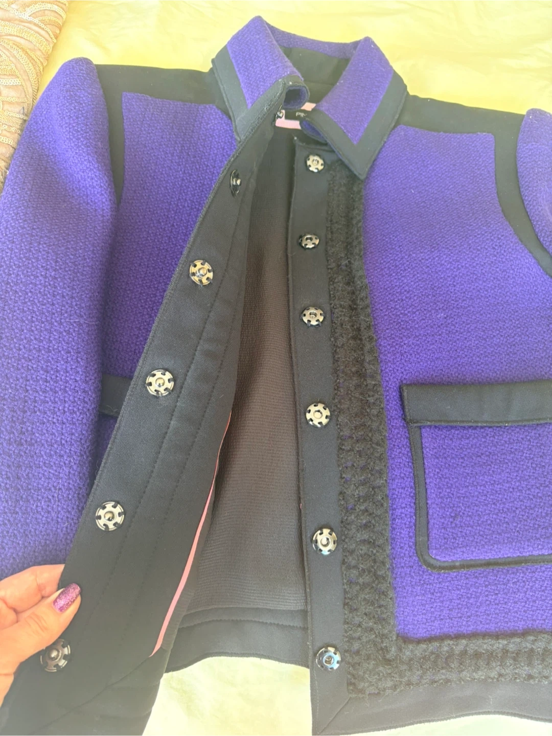 Elegant purple women’s suit in like new condition. Striking rich colour and texture, bold structure and sophisticated detailing with black accents. Exudes business-like femininity.
