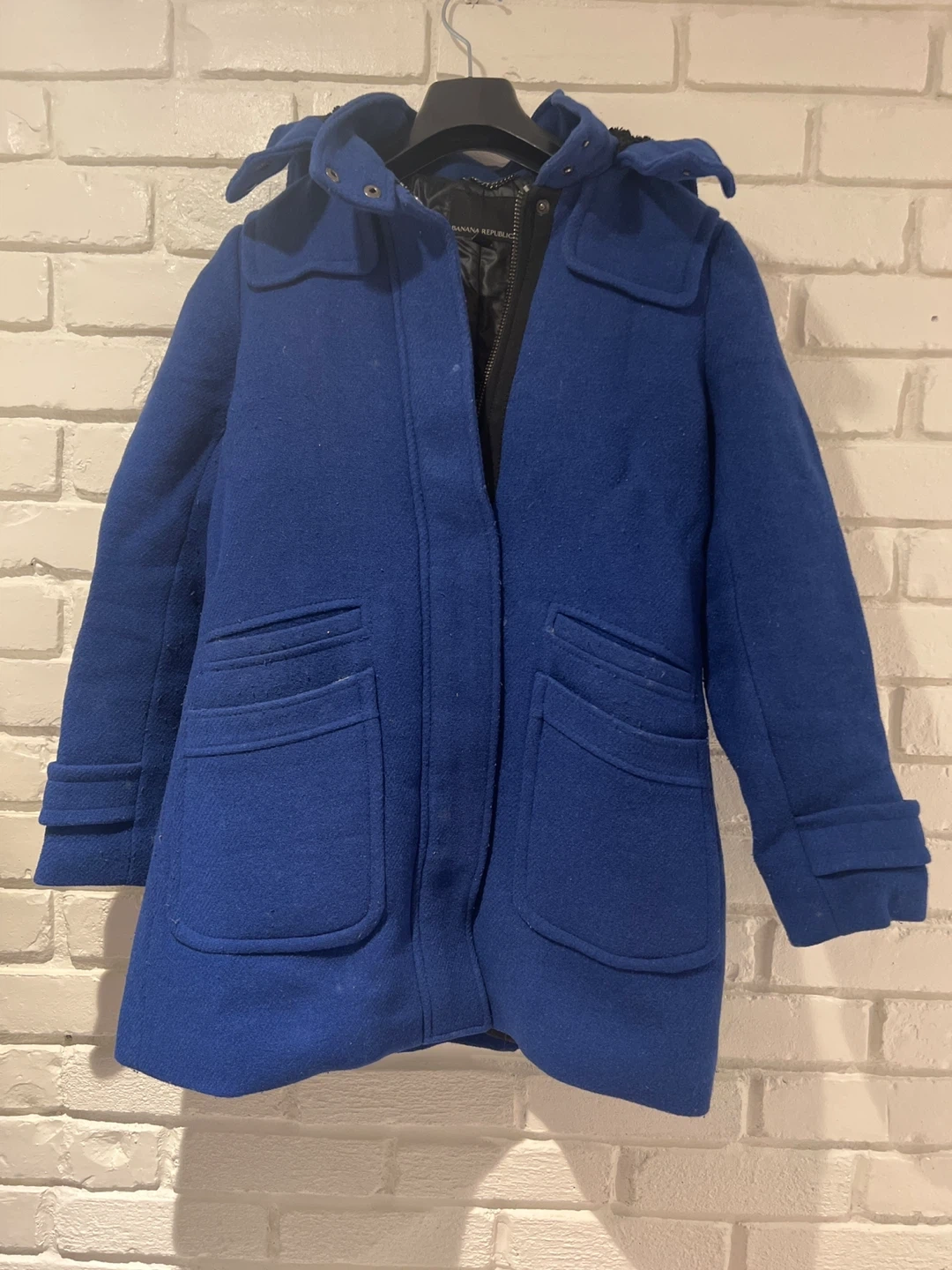 Banana Republic blue duffle coat with a hood. Wool blend fabric. Two front flap pockets and button details on the cuffs. Zipper and toggle closure.