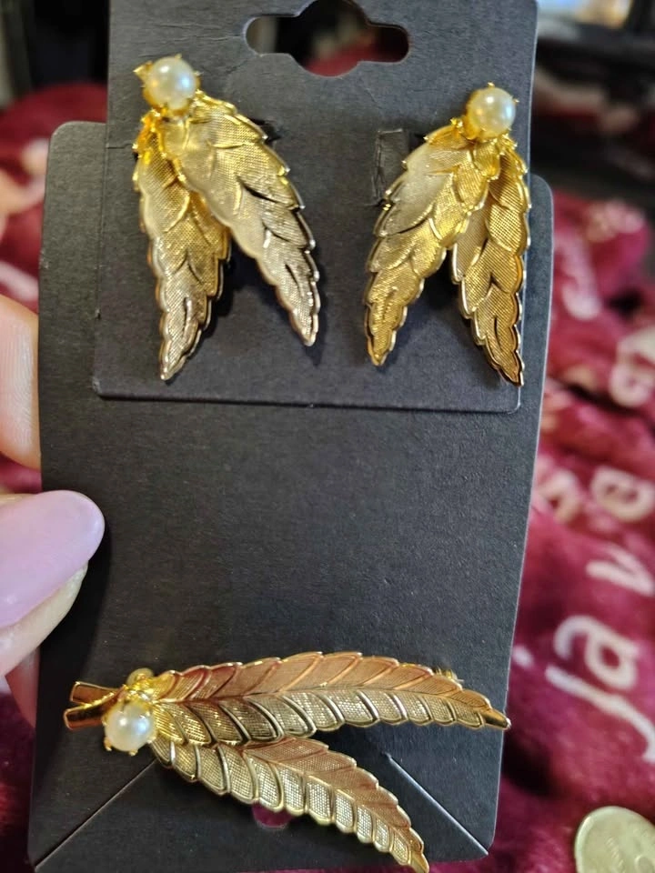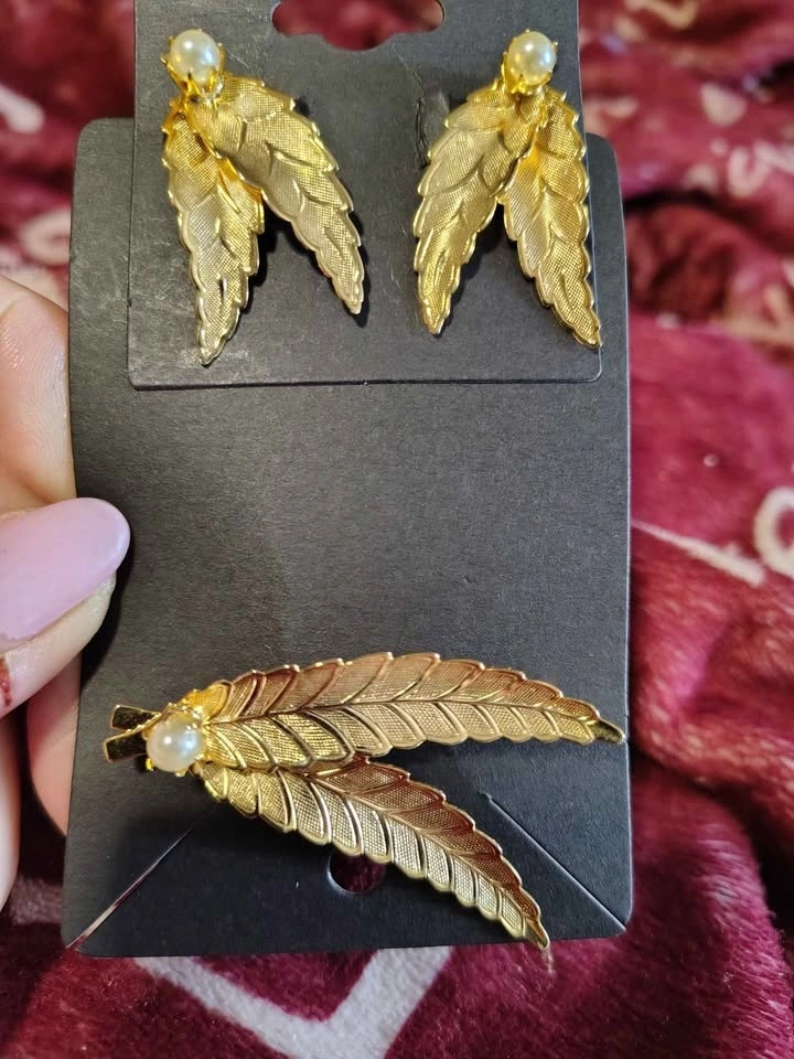 Vintage set of gold-toned leaf-shaped jewelry, including a brooch and matching clip-on earrings, likely manufactured by Turin Inc or similar costume jewelry. Located in Crowsnest Pass.