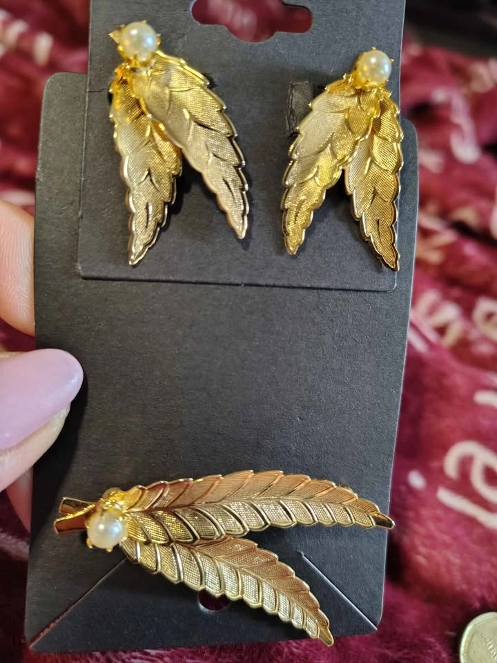 Vintage set of gold-toned leaf-shaped jewelry, including a brooch and matching clip-on earrings, likely manufactured by Turin Inc or similar costume jewelry. Located in Crowsnest Pass.