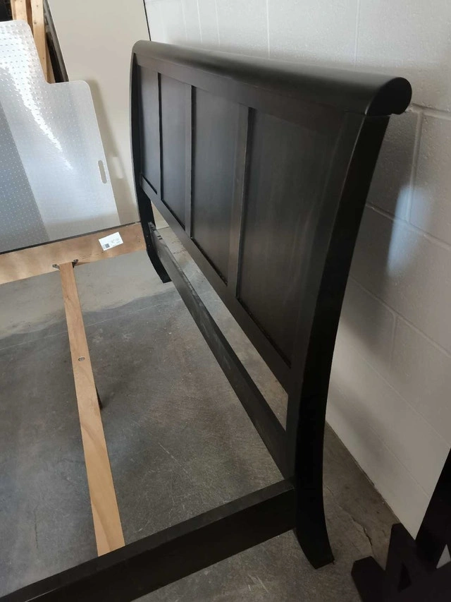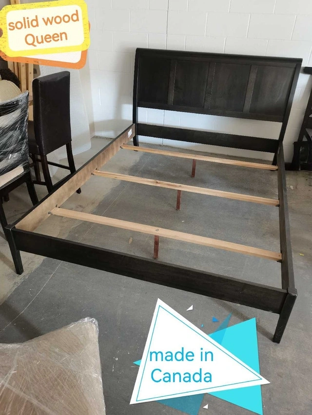 This solid wood queen-size bed frame is both stylish and sturdy, featuring a sleek, dark finish that complements any bedroom decor. Used but remains in good condition, offering a reliable and attractive foundation for your mattress. Additional details include: