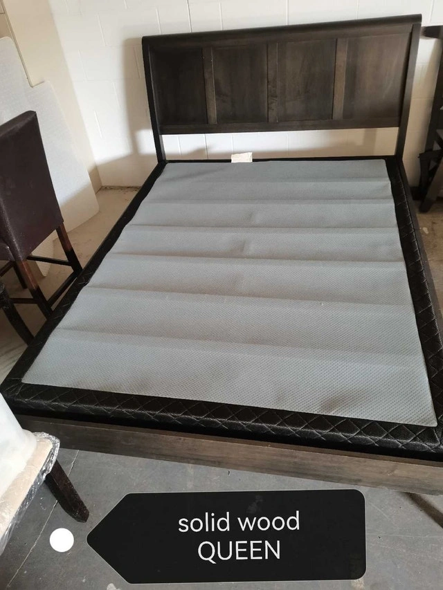 This solid wood queen-size bed frame is both stylish and sturdy, featuring a sleek, dark finish that complements any bedroom decor. Used but remains in good condition, offering a reliable and attractive foundation for your mattress. Additional details include: