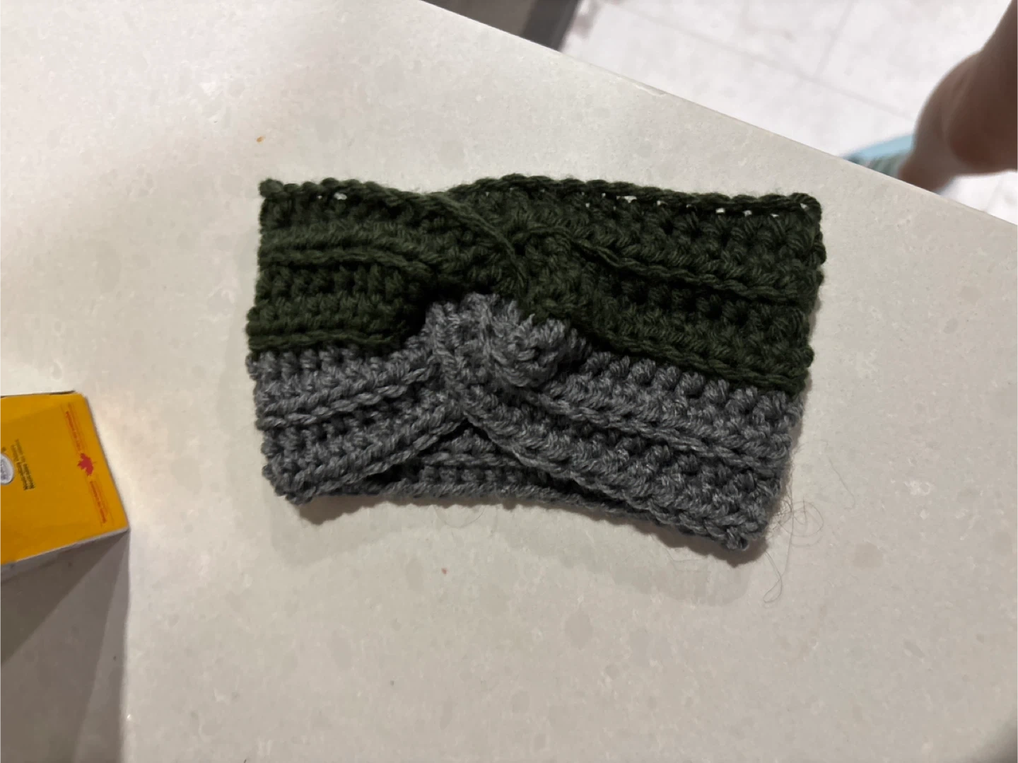 Selling a handmade crocheted headband. It's a comfy blend of green and grey yarn. Perfect for keeping your hair back or adding a little handmade charm to your outfit!