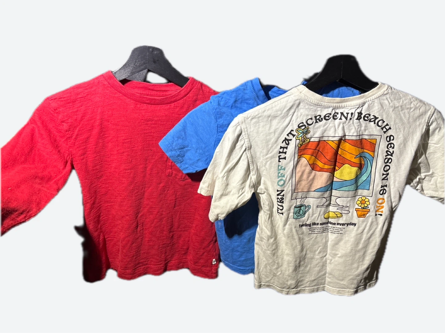 Selling a bundle of three t-shirts! Includes a red long-sleeve, a blue short-sleeve, and a white graphic tee with a fun beach design on the back. All in good condition!