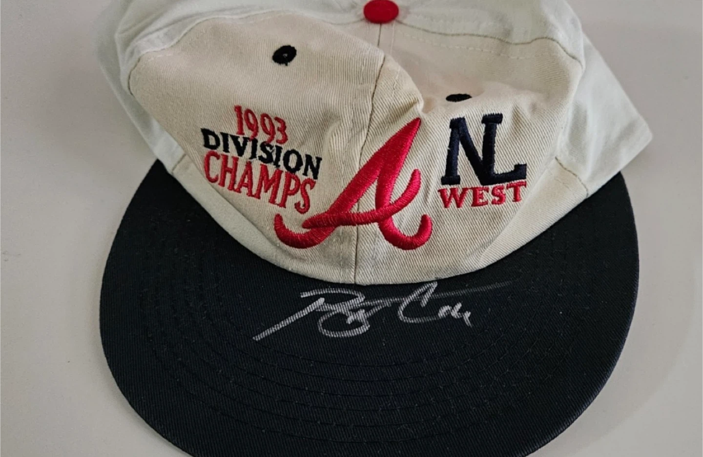 This item is an autographed Bobby Cox Atlanta Braves hat cap, signed by the Hall of Famer himself. He was the manager of the Braves. I was at the Braves game in 1994; the hats were a giveaway that day. The hat is a genuine original piece, featuring the signature of Bobby Cox, a legendary baseball player who made a significant impact on the Atlanta Braves team.