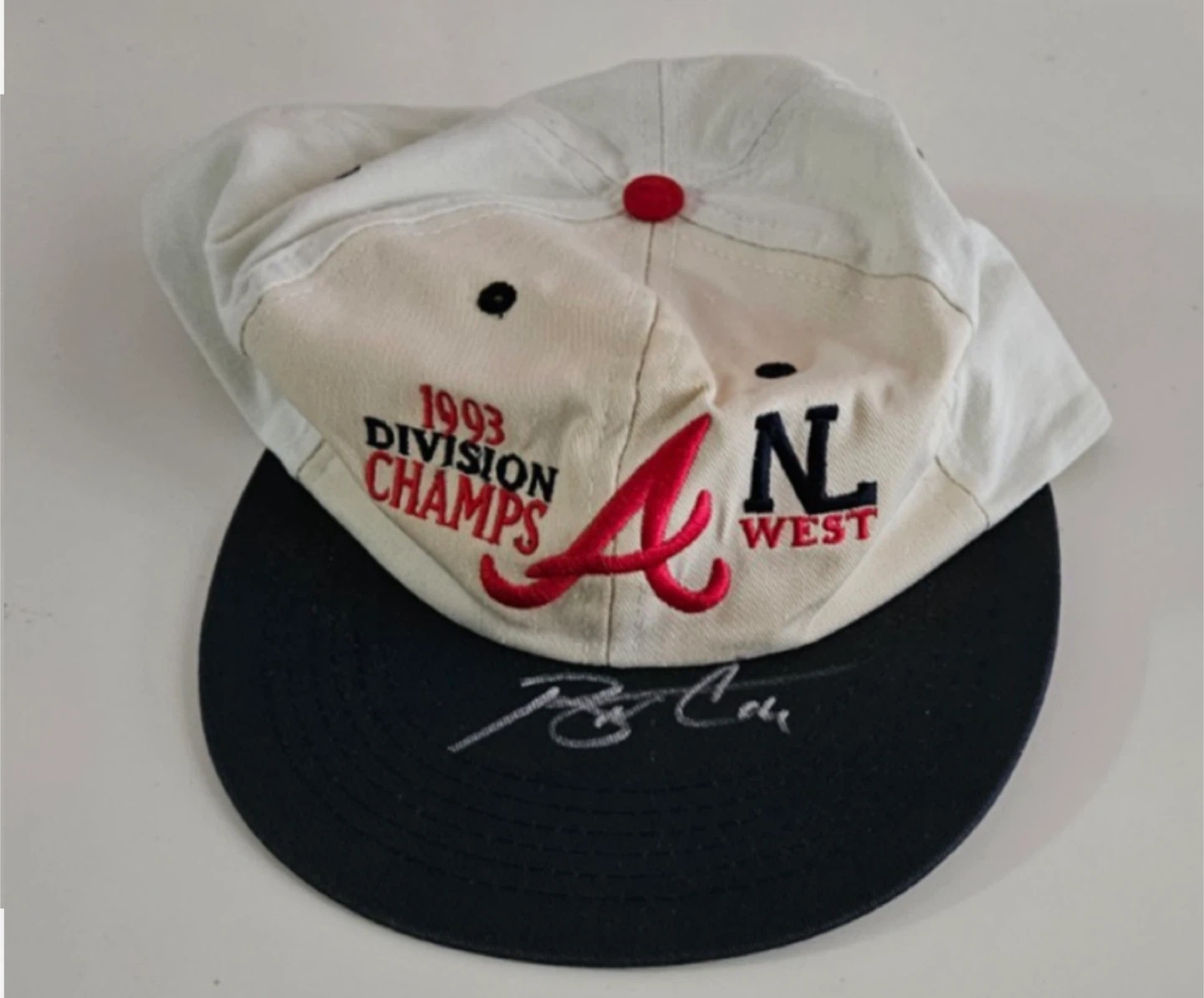 Some yellowing on front of cap, due to age of cap. Never worn. This unique item would be a prized possession for any fan of baseball or the Atlanta Braves, showcasing their admiration for the team and player alike.