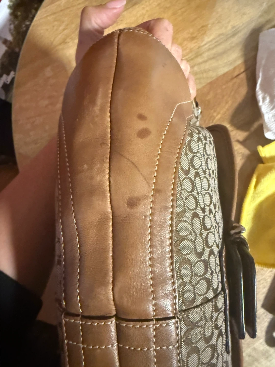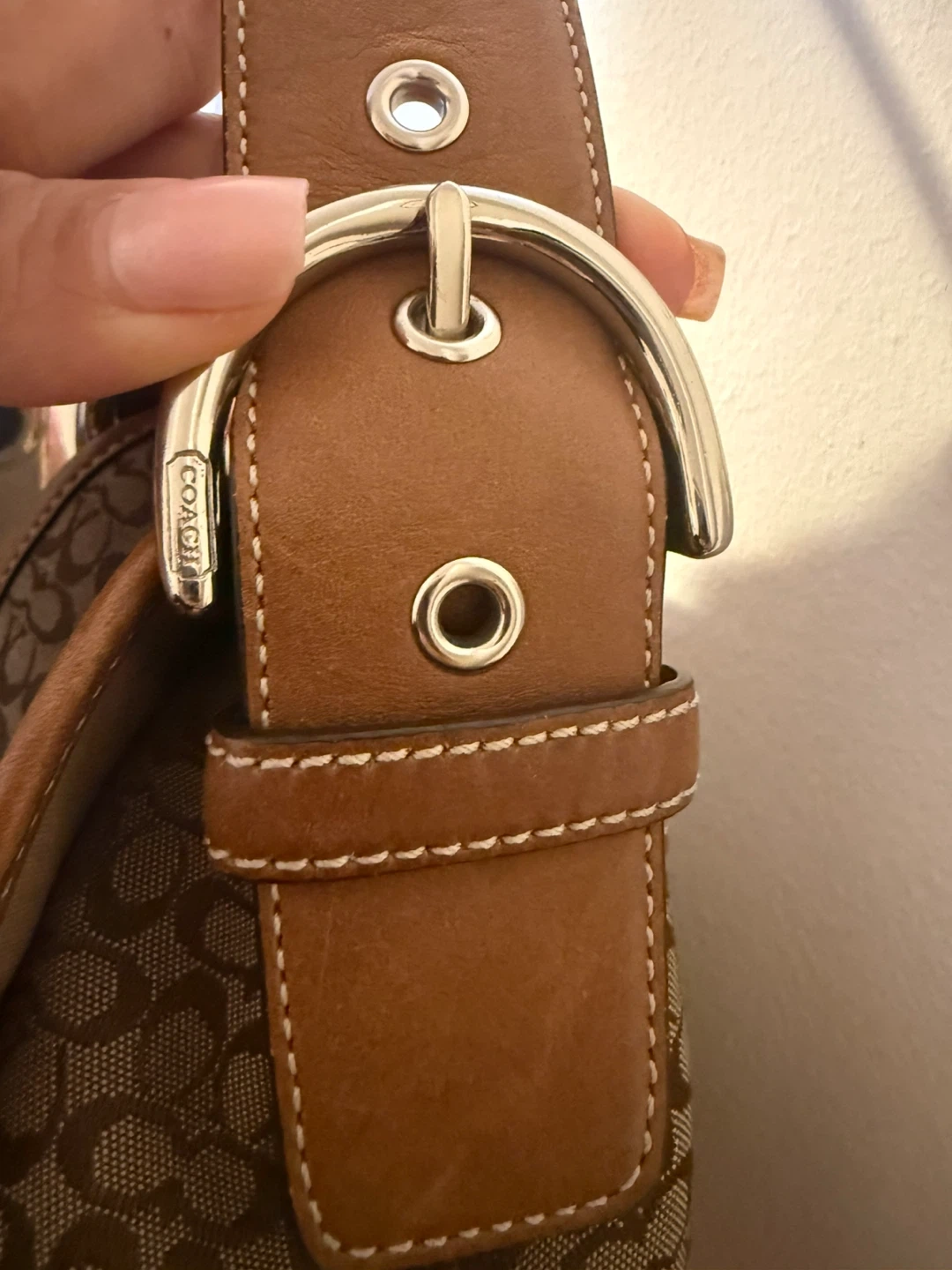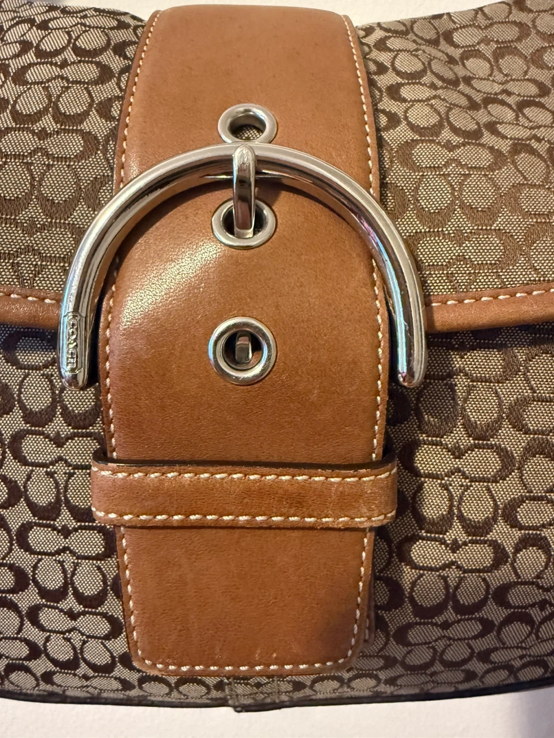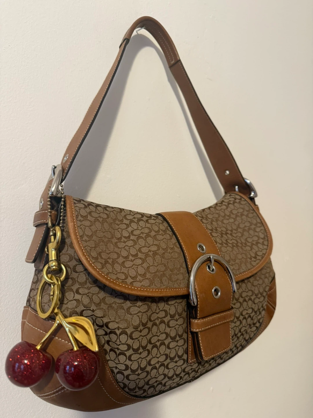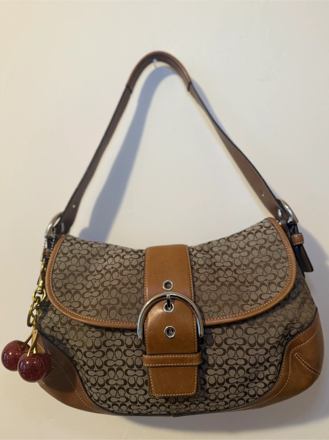 This is a classic Coach Soho bag #6808 featuring the signature monogram pattern with tan leather trim. It has a large metal buckle closure on the front flap and comes with a cute cherry charm. Some minor marks on the leather trim.