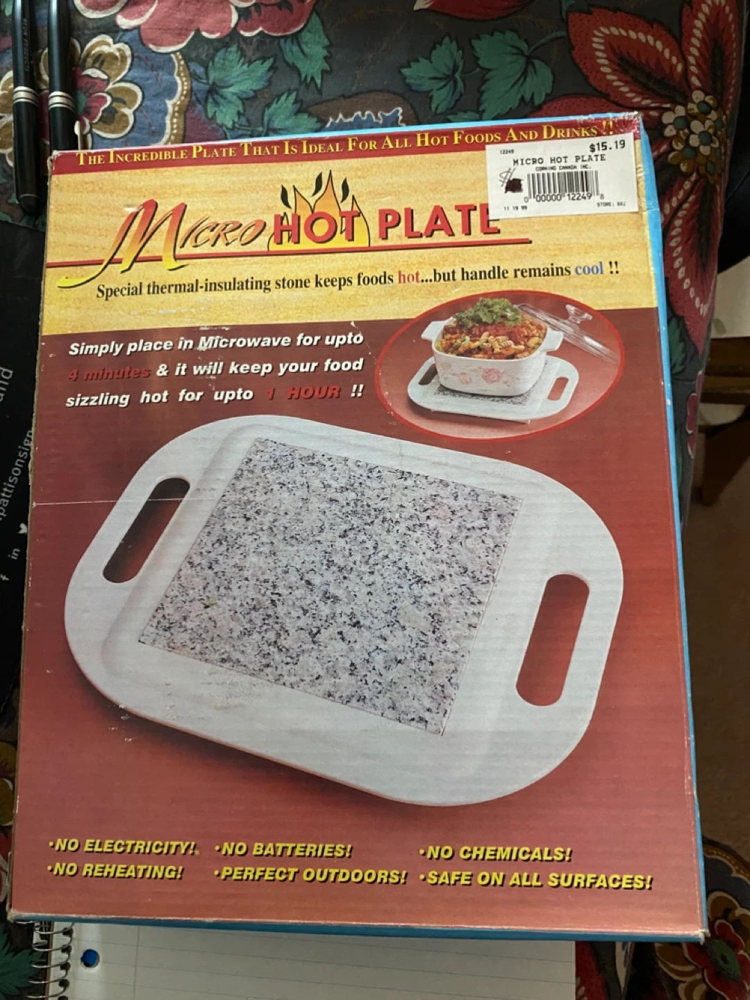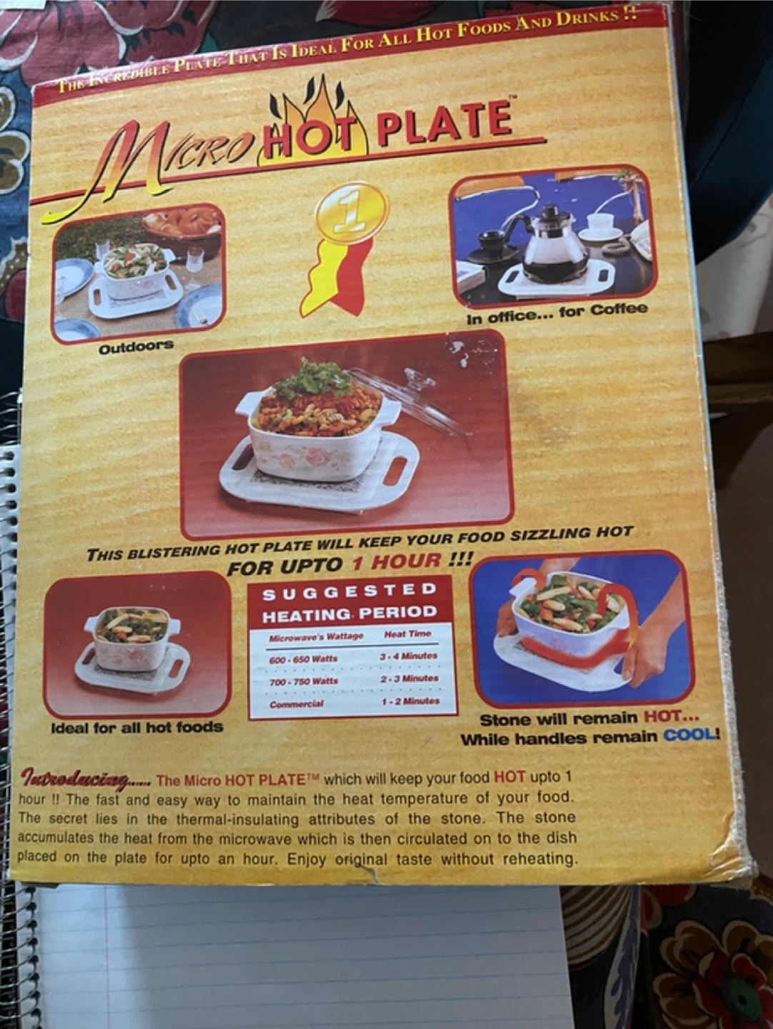 Keep your food sizzling hot for up to 1 hour with this Micro Hot Plate! It's a special thermal-insulating stone that keeps food hot, but the handles remain cool. It's safe on all surfaces and perfect for outdoors