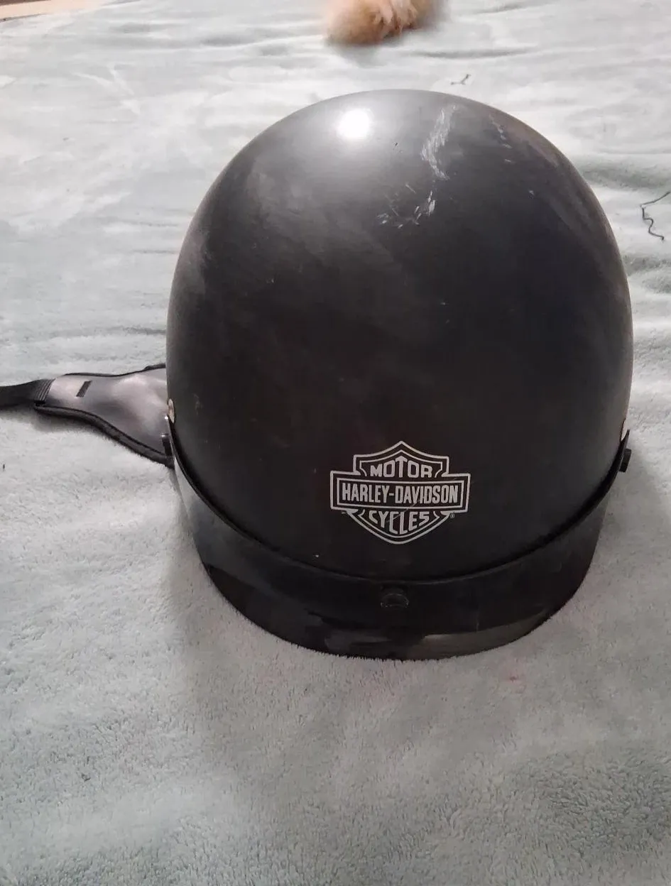 This is a black Harley-Davidson motorcycle helmet. It features the classic Harley-Davidson Cycles logo on the front. Shows some signs of wear, as visible in photos.
